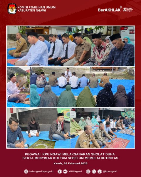 Pada agenda hari Kamis (26/02/2026) pukul 09.00 WIB, seluruh jajaran KPU Ngawi melaksanakan ibadah Sholat Duha berjamaah yang dilanjutkan dengan Kultum (Kuliah Tujuh Menit) sebagai siraman rohani. Bertindak sebagai imam sekaligus penceramah dalam kesempatan tersebut adalah Muhammad Prasetyo Nugroho, Anggota Divisi Teknis Penyelenggaraan KPU Ngawi.