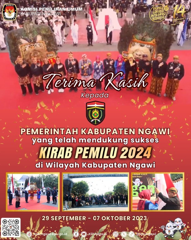 Melalui media sosial resmi serta website, Ketua KPU Kabupaten Ngawi Prima Aequina Sulistyanti beserta jajaran menyampaikan terimakasih kepada Pemerintah Kabupaten Ngawi, PPK pada 19 Kecamatan, PPS pada 217 Desa/Kelurahan, serta semua pihak yang telah mendukung sukses pelaksanaan Kirab Pemilu 2024 di Kabupaten Ngawi, termasuk Polres Ngawi beserta jajaran serta Kodim 0805 beserta jajaran, yang turut mengawal perjalanan Kirab hingga wilayah desa/kelurahan.