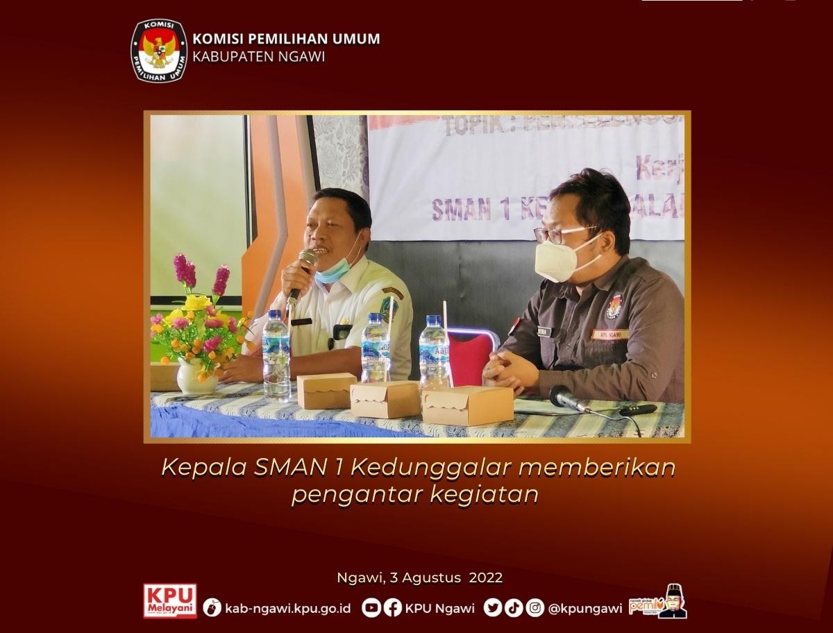 Kepala SMAN 1 Kedunggalar Sriyono, dalam sambutannya menyampaikan pentingnya demokrasi serta penguatan nilai-nilai pancasila yang senada dengan laju kurikulum merdeka. Pihaknya berharap, kegiatan ini bisa memberikan wawasan kepada pelajatr, agar dapat lebih memahami demokrasi, tahapan2 pemilu serta informasi lainnya yang selaras dengan pelajaran.