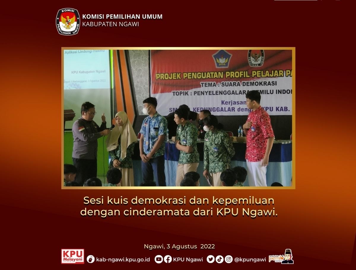 Ngawi, kpu-ngawi.kpu.go.id - Rabu (3/8/2022) - KPU Kabupaten Ngawi mendapatkan amanah untuk mengisi materi Penguatan Profil Pelajar Pancasila dengan tema Suara Demokrasi, di SMA Negeri 1 Kedunggalar. Kegiatan dilaksanakan di aula sekolah mulai pukul 13.00 WIB.