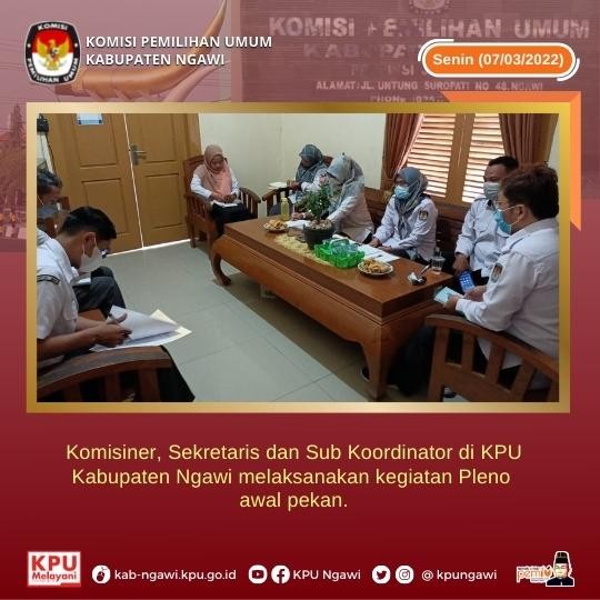 Ngawi, kab-ngawi.kpu.go.id - Senin (07/03/2022) Komisioner, Sekretaris dan Sub Koordinator KPU Kabupaten Ngawi kembali melaksanakan pleno awal pekan. Agenda ini merupakan kegiatan rutin untuk melakukan pembahasan hal-hal perencanaan kegiatan minggu depan, evaluasi kegiatan pekan lalu dan realisasi kegiatan pekan ini.