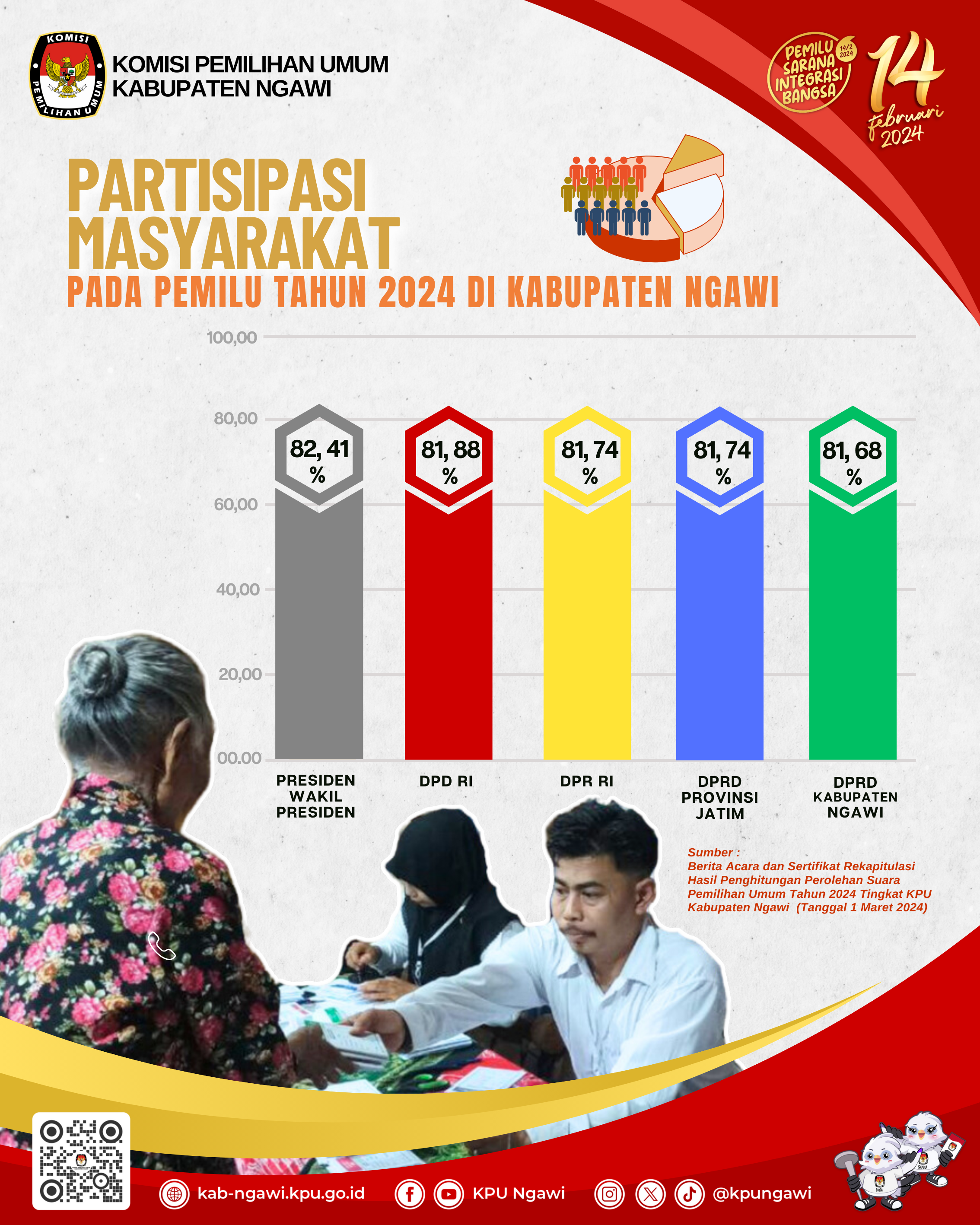 Ngawi, kab-ngawi.kpu.go.id – Dalam kegiatan Rekapitulasi Penghitungan Suara Pemilu 2024 Tingkat KPU Kabupaten Ngawi tanggal 1 Maret 2024, diketahui angka partisipasi masyarakat dalam menggunakan hak pilihnya, adalah sebagai berikut :