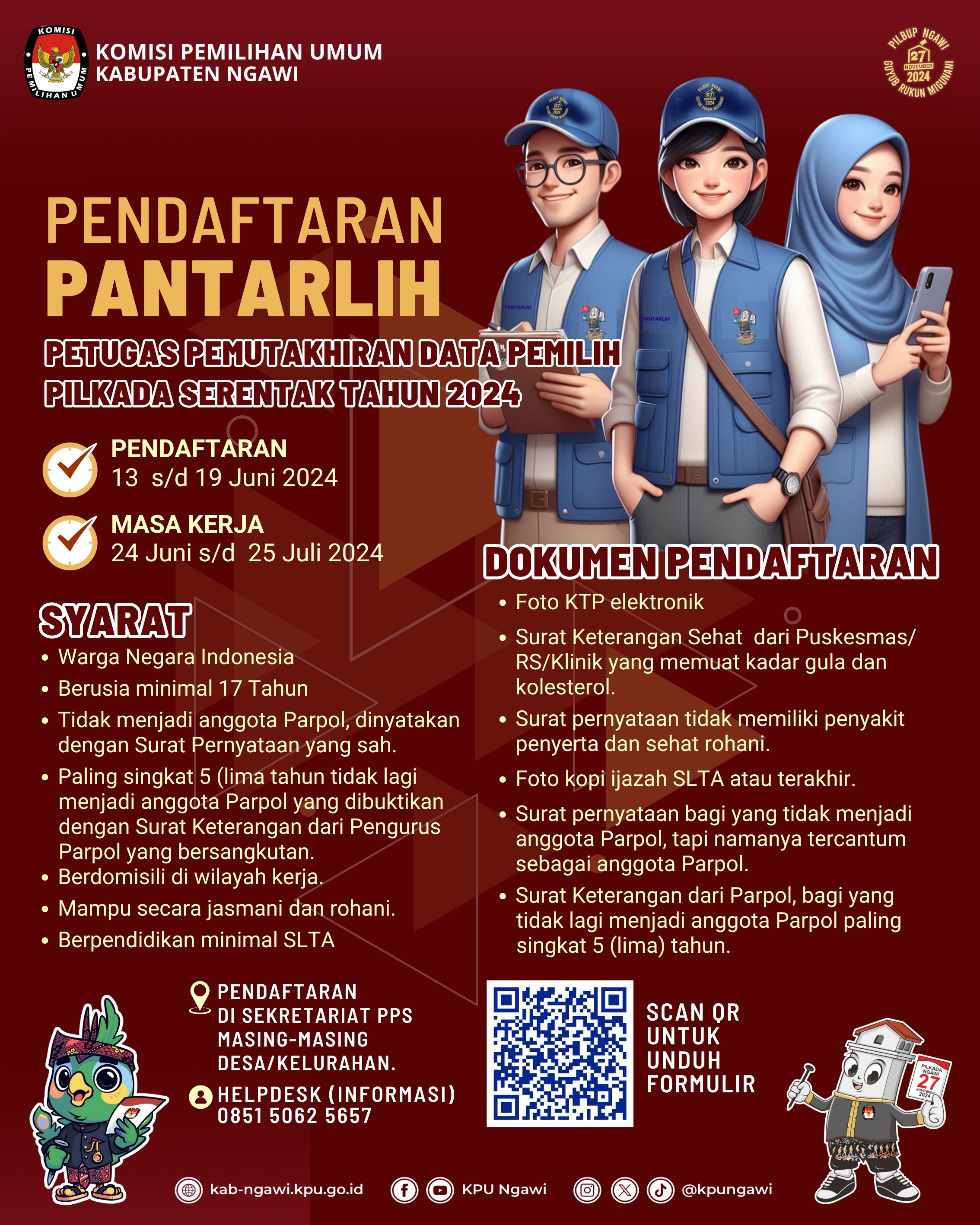 Dalam rangka pembentukan Calon Petugas Pemutakhiran Data Pemilih untuk Pemilihan Gubernur dan Wakil Gubernur, Bupati dan Wakil Bupati, dan Wali Kota dan Wakil Wali Kota Tahun 2024, Komisi Pemilihan Umum Kabupaten Ngawi melalui Panitia Pemungutan Suara pada setiap Desa/Kelurahan mengundang Warga Negara Indonesia yang memenuhi kualifikasi untuk mendaftarkan diri menjadi Pantarlih dengan ketentuan sebagai berikut: