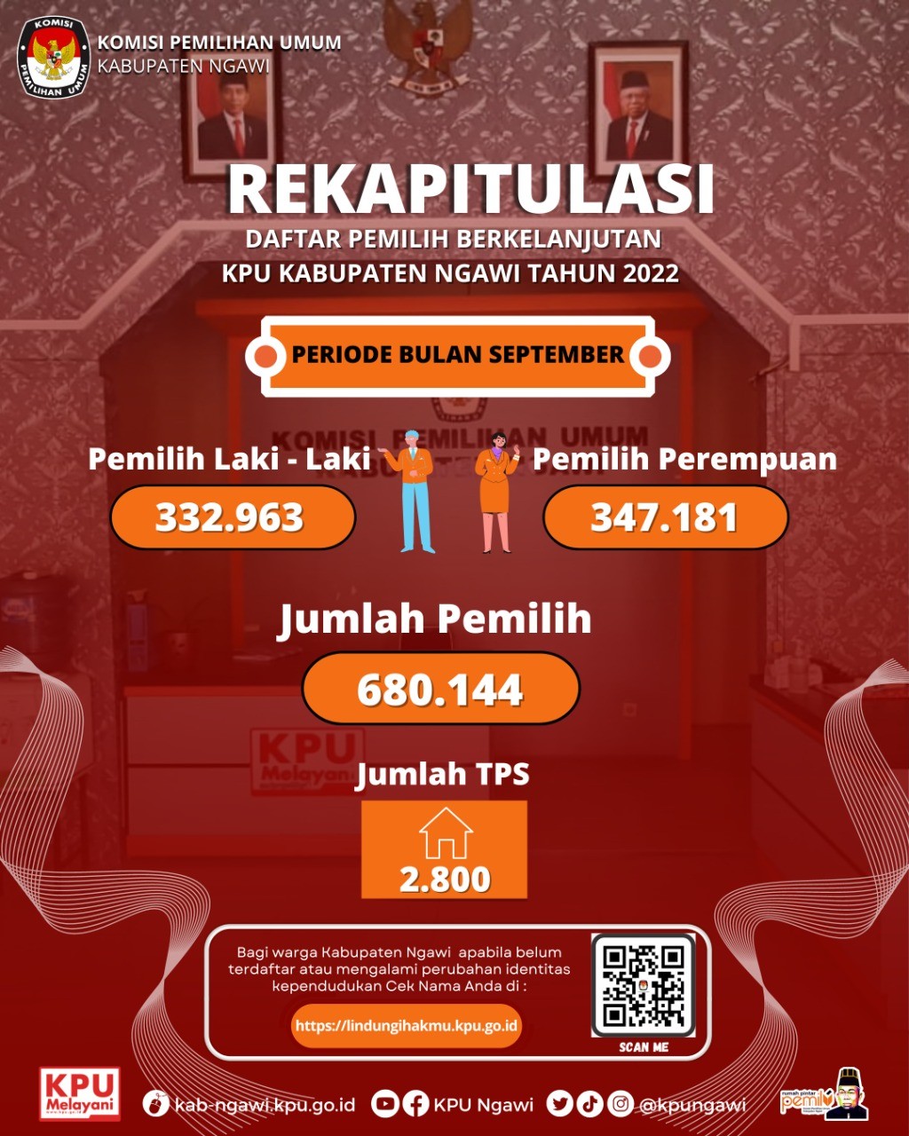 KPU Kabupaten Ngawi terus melaksanakan Pemutakhiran Daftar Pemilih Berkelanjutan. Pada Bulan Septembner 2022 rekapitulasi daftar pemilih tingkat Kabupaten adalah sebagai berikut :