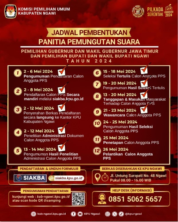 Berikut pengumuman hasil seleksi wawancara PPS sekaligus Penetapan PPS Pilkada Tahun 2024 untuk wilayah kabupaten Ngawi <<klik disini>>