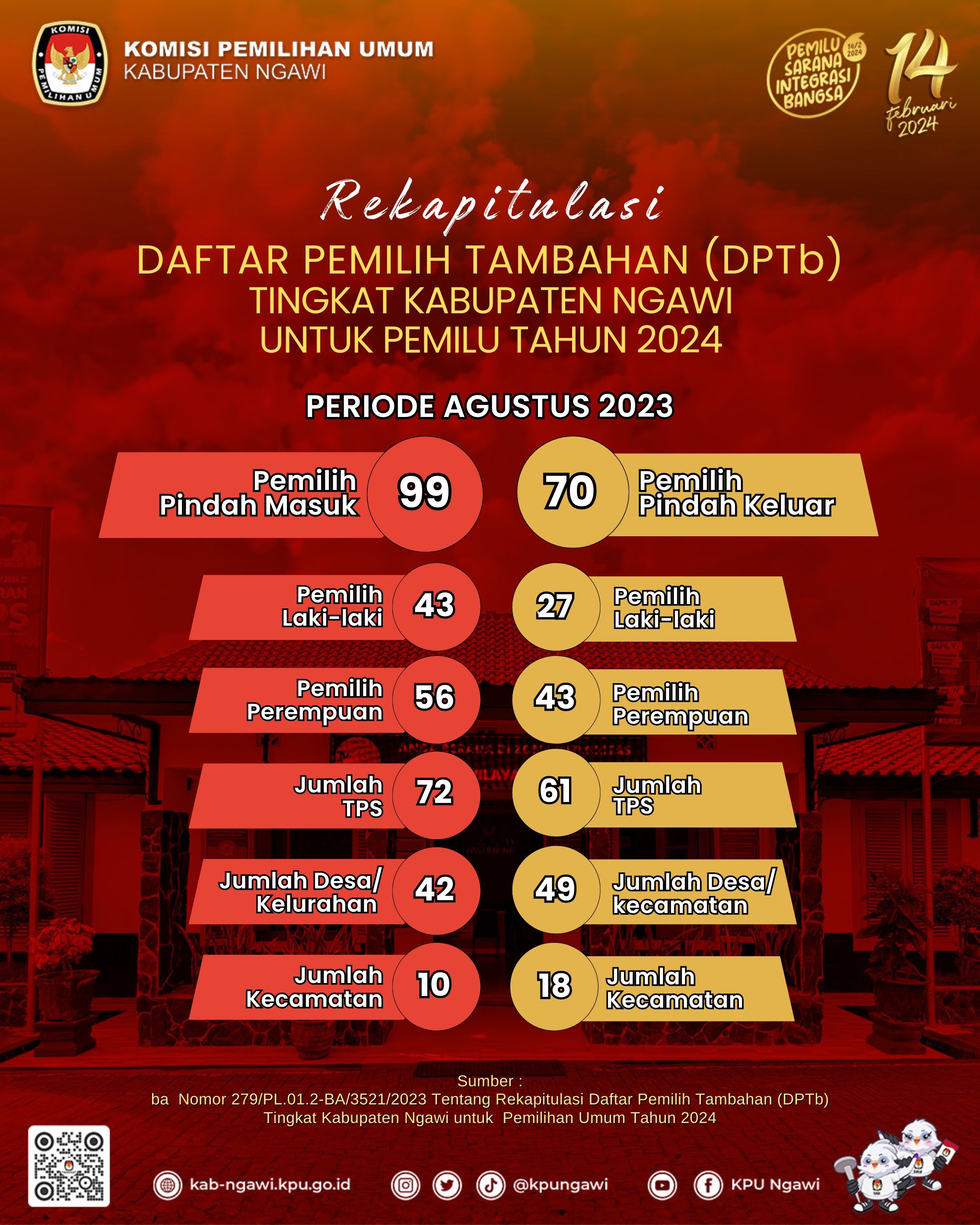 Berikut ini Jumlah Pemilih Tambahan (DPTb) Kabupaten Ngawi Bulan Agustus 2023.