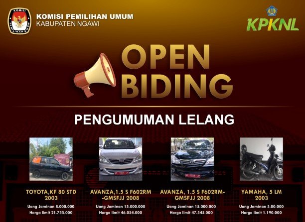 Panitia Lelang Komisi Pemilihan Umum Kabupaten Ngawi akan melaksanakan lelang melalui internet dengan cara penawaran Open Bidding Barang Milik Negara berupa Kendaraan Bermotor Roda 4 sebanyak 3 (tiga) unit dan roda 2 sebanyak 1 (satu) unit dengan perantara Kantor Pelayanan Negara dan Lelang (KPKNL) Madiun dengan rincian barang pada pengumuman yang bisa diunduh berikut ini :