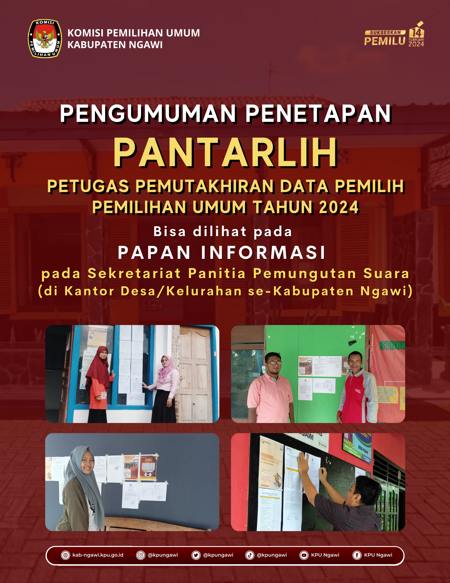 Pengumuman Penetapan Petugas Pemutakhiran Pemilih di setiap Desa dan Kelurahan bisa di lihat (baca) pada papan pengumuman pada Sekretariat PPS. atau di masing-masing kantor desa/kelurahan se Kabupaten Ngawi.