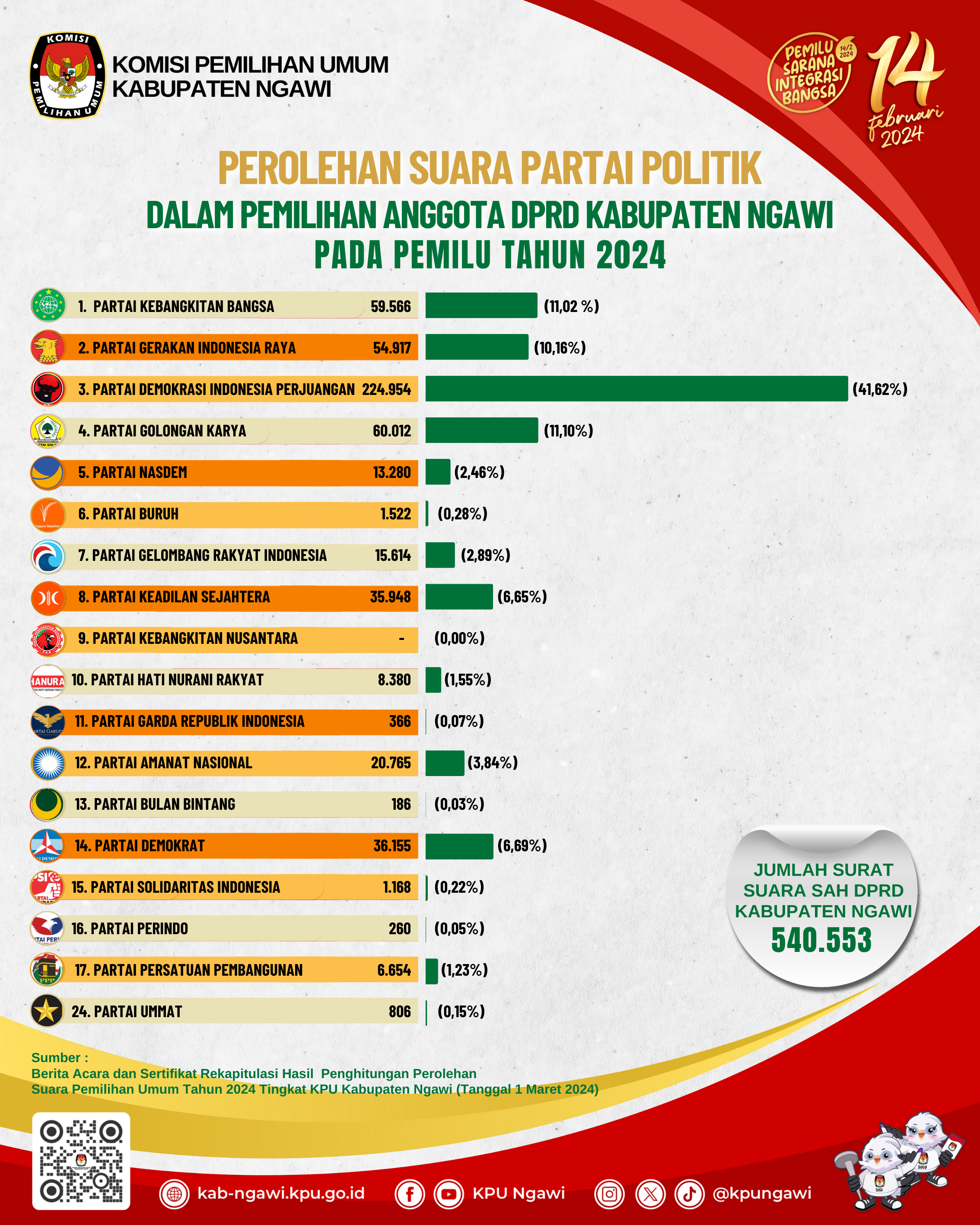 Dengan Total Suara Sah untuk Dewan Perwakilan Daerah Kabupaten Ngawi adalah 540.553