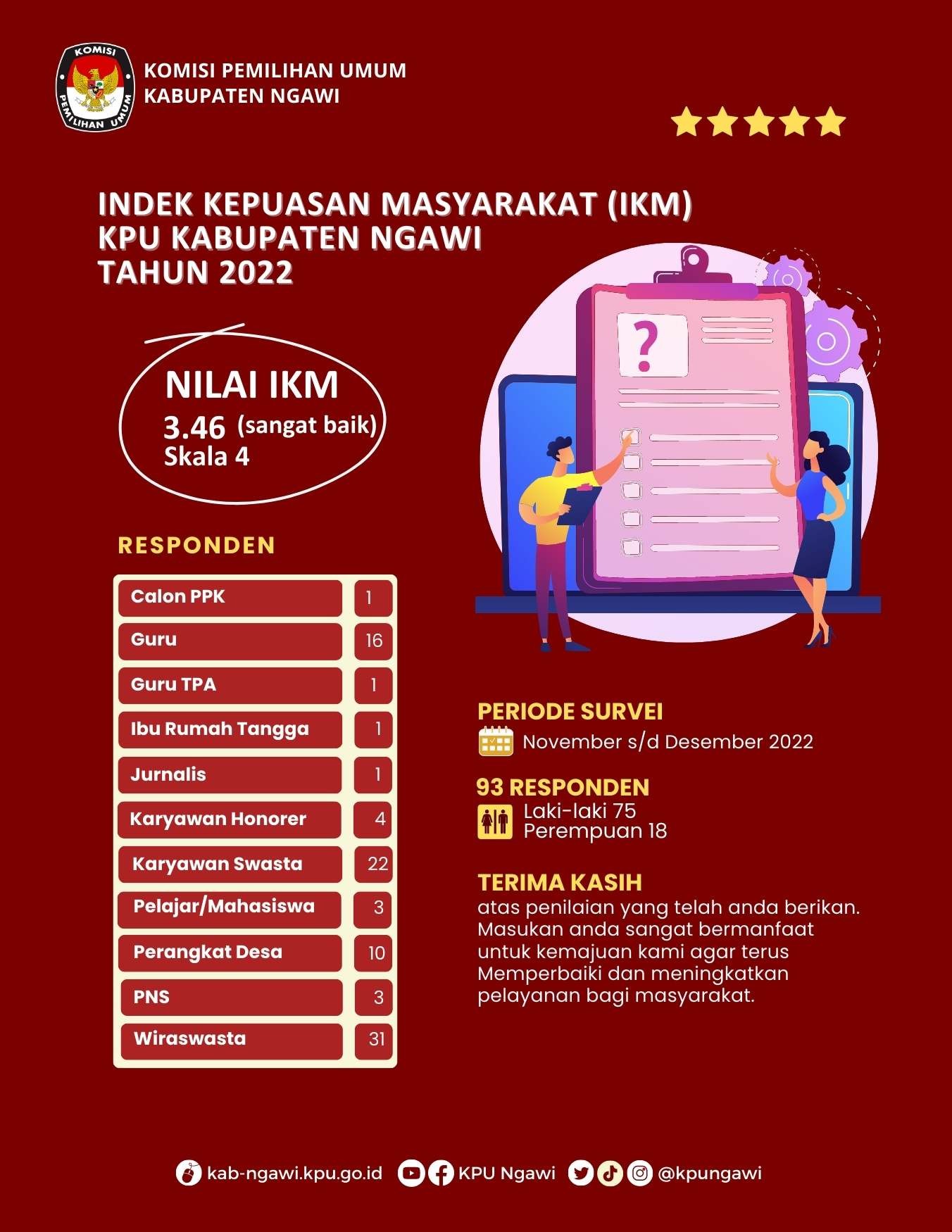 Dari kegiatan yang dilaksanakan pada November - Desember 2022, diperoleh informasi survey sebagai berikut. Responden yang mengikuti kegiatan berjumlah 93 orang, terdiri dari laki-laki 75 dan perempuan 18 orang. Adapun untuk Nilai Indek Kepuasan Umum atau IKM diraih sebesar 3,46 atau sangat baik.