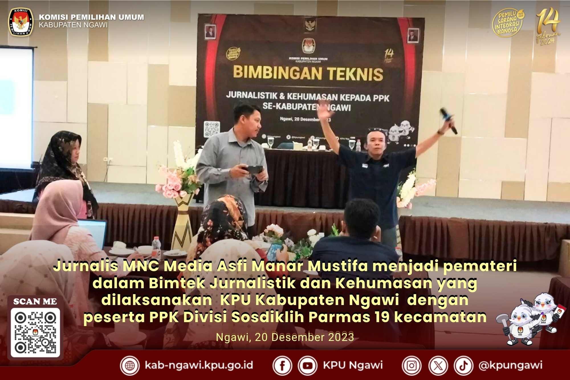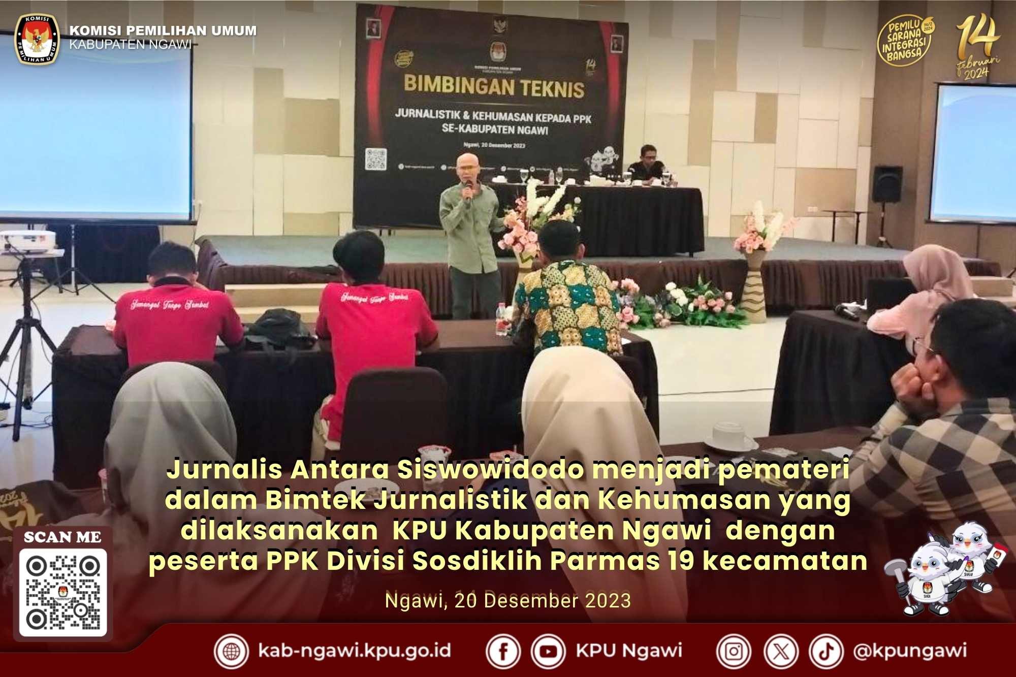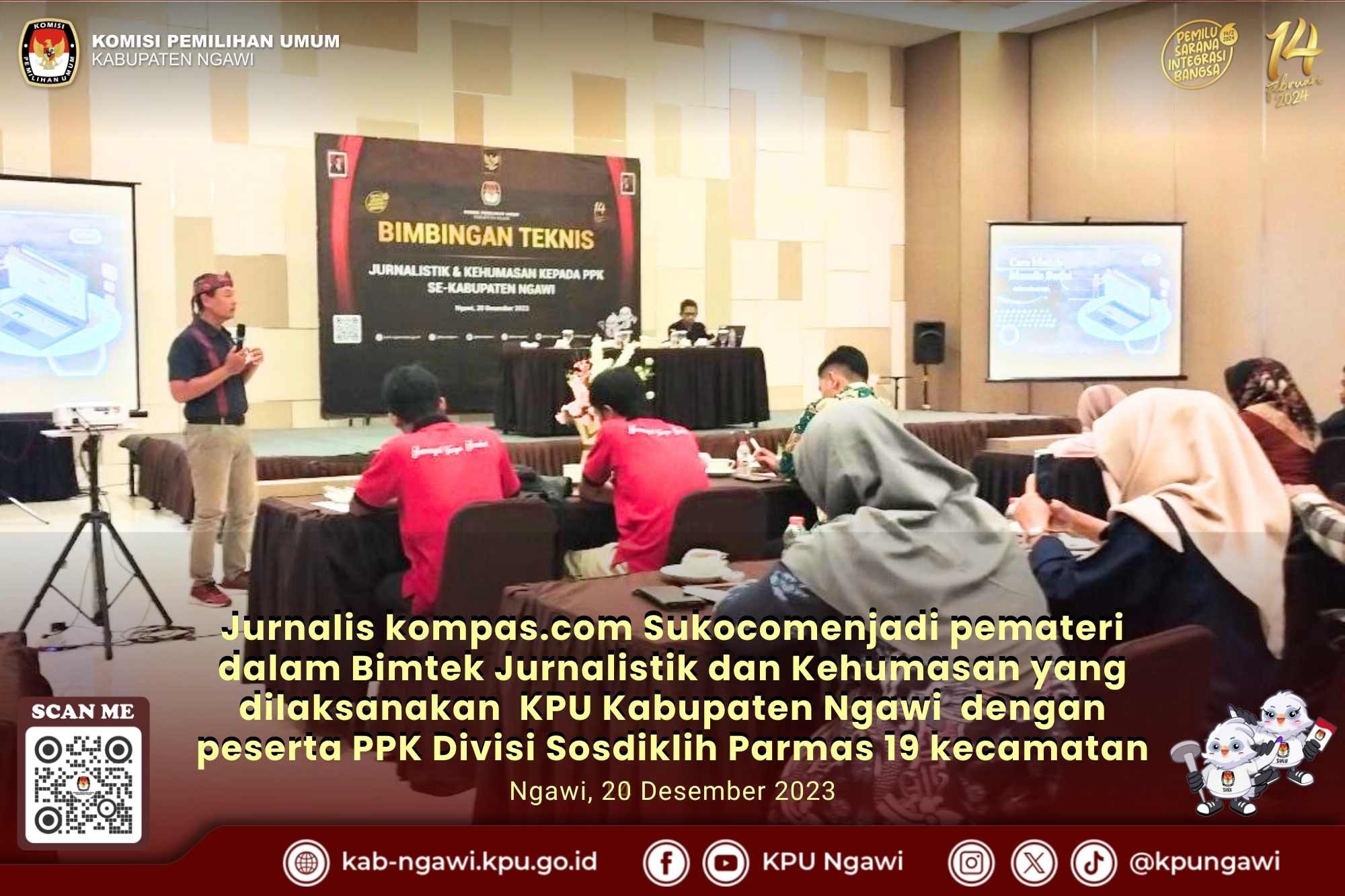 Ngawi, kab-ngawi.kpu.go.id - Komisi Pemilihan Umum Kabupaten Ngawi menggelar Bimbingan Teknis Jurnalistik dan Kehumasan pada PPK. Kegiatan dilaksanakan pada Rabu (20/12/2023) dI Kurnia Convention Hall Ngawi.