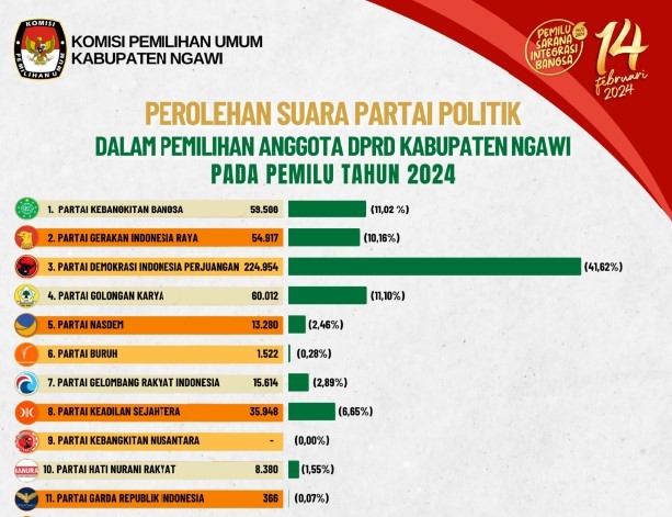 Dari rekapitulasi penghitungan perolehan suara Pemilu 2024, nanti akan diketahui hasil total suara Pemilu di Kabupaten Ngawi. Bupati Mengingatkan bahwa, nantinya apapun hasilnya menjadi penentu kepemimpinan di setiap tingkatan. Dimana hal itu akan bermuara pada kesejahteraan bagi masyarakat di Kabupaten Ngawi.