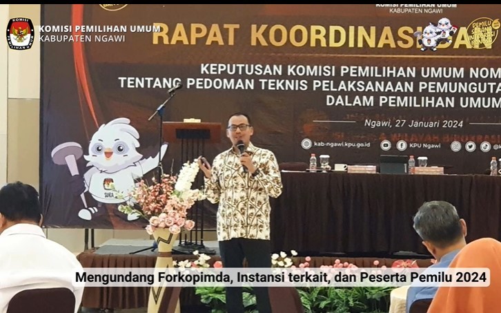 Acara berlangsung pada Sabtu (27/1/2024) di Kurnia Convention Hall Jl. Soekarno Ngawi, dikemas dalam Rakor dan Sosialisasi Keputusan KPU Nomor 66 Tahun 2024 tentang Pedoman Teknis Pelaksanaan Pemungutan dan Penghitungan Suara dalam Pemilihan Umum.