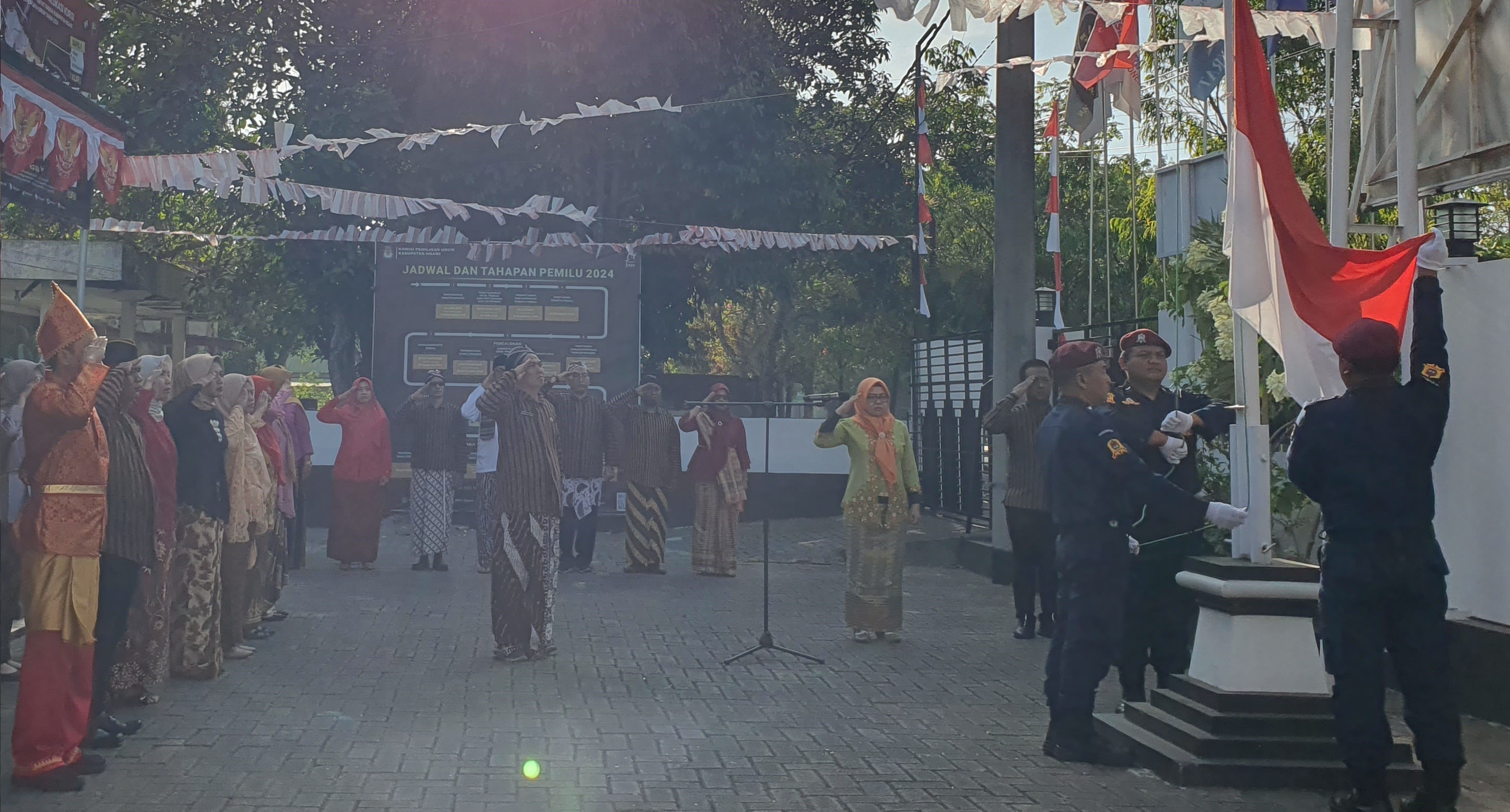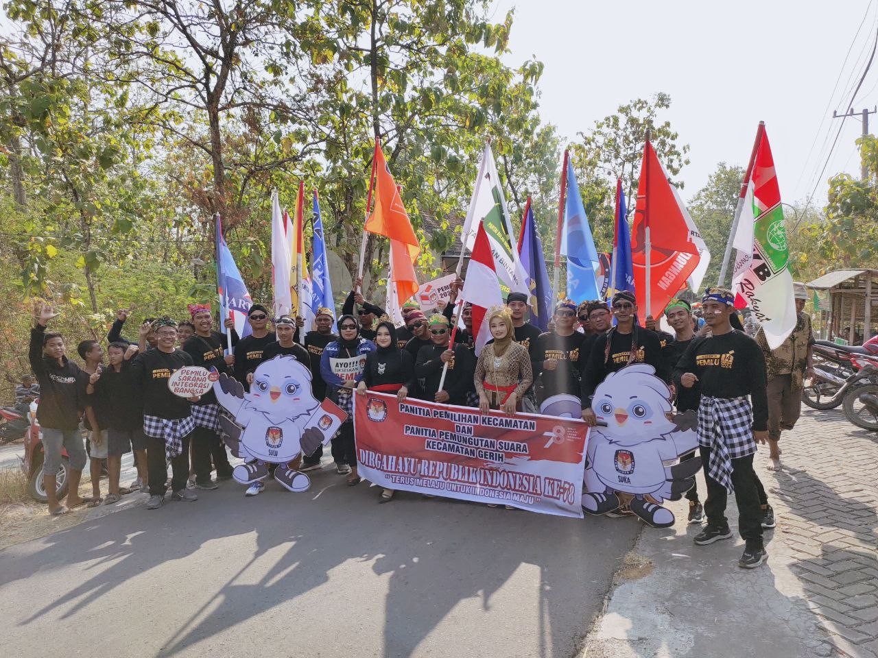 Ngawi, kab-ngawi.kpu.go.id - Dalam memeriahkan hari kemerdekaan Republik Indonesia, KPU Kabupaten Ngawi melalui jajarannya PPK dan PPS mengikuti karnaval diberbagai Kecamatan di Bulan Agustus 2023. Karnaval menjadi momentum warga di tingkat Kecamatan untuk berkumpul dipusat Kecamatan menyaksikan pawai HUT RI. Sudarsono Anggota KPU Ngawi Divisi SosIalisasi Pendidikan Pemilih, Partisipasi Masyarakat dan SDM selaku Ketua Divisi Sosialisasi, pendidikan pemilih, partisipasi masyarakat dan sumber daya manusia mengatakan bahwa KPU Ngawi mengapresiasi PPK PPS yang memeriahkan HUT RI dengan berbagai Kecamatan, baik karnaval, jalan sehat maupun kegiatan lainnya. “Selain wujud kegembiraan di hari kemerdekaan, ini juga menjadi momentum bagi jajaran kami untuk sosialisasi tahapan Pemilu 2024. Sebagain besar menampilkan maskot Sura Sulu dan Bendera Parpol Peserta Pemilu 2024. Seperti diketahui, sosialisasi merupakan tyugas melekat pada diri setiap penyelenggara.” Kata Pak Dar. Dalam Karnaval maupun jalan sehat, diantara tema besar yang disampaikan meliputi hari pemungutan suara serentak yang akan dilaksanakan pada Rabu 14 Februari 2024, ajakan untuk mengecek dalam daftar pemilih, jumlah Parpol Peserta Pemilu 2024, serta Daerah Pemilihan sesuai Kecamatan setempat, dimana karnaval dilaksanakan.