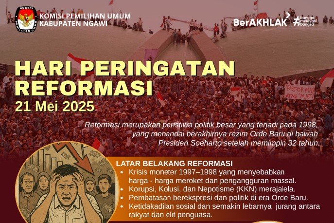 Ngawi, kab-ngawi.kpu.go.id – Tanggal 21 Mei setiap tahunnya diperingati sebagai Hari Reformasi, sebuah momentum penting dalam sejarah bangsa Indonesia yang menandai berakhirnya era Orde Baru dan dimulainya era baru yang lebih demokratis. Gerakan Reformasi bermula dari krisis moneter Asia pada tahun 1997 yang menghantam perekonomian Indonesia. Nilai tukar rupiah terjun bebas, inflasi melambung, dan daya beli masyarakat menurun drastis. Ketidakpuasan terhadap pemerintahan Orde Baru semakin menguat karena berbagai praktik korupsi, kolusi, dan nepotisme (KKN) yang telah mengakar selama puluhan tahun. Aksi mahasiswa dan elemen masyarakat yang menuntut perubahan menyebar di berbagai kota. Puncaknya terjadi pada Mei 1998, ketika ribuan mahasiswa menduduki Gedung DPR/MPR dan gelombang demonstrasi besar terjadi di seluruh negeri. Situasi ini memaksa Presiden Soeharto, yang telah berkuasa selama 32 tahun, untuk mengundurkan diri pada tanggal 21 Mei 1998. Selanjutnya kepemimpinan nasional, diserahkan kepada Wakil Presiden B.J. Habibie. Pengunduran diri Soeharto menjadi titik awal dari era Reformasi, sebuah babak baru dalam perjalanan bangsa yang ditandai dengan komitmen untuk membangun sistem pemerintahan yang lebih terbuka, demokratis, serta berorientasi pada keadilan dan kesejahteraan rakyat. Reformasi membawa dampak besar terhadap kehidupan demokrasi di Indonesia. Pemilu yang sebelumnya tidak bebas dan tidak adil, berubah menjadi pemilu langsung yang memberikan hak penuh kepada rakyat untuk memilih pemimpin mereka. Lahirnya lembaga-lembaga independen seperti Komisi Pemilihan Umum (KPU) menjadi tonggak penting dalam mewujudkan sistem demokrasi yang lebih sehat dan terpercaya. Kini, setelah lebih dari dua dekade Reformasi, demokrasi Indonesia telah mengalami banyak kemajuan. Namun tantangan juga tetap ada. Oleh karena itu, semangat Reformasi perlu terus dijaga dan diperkuat, terutama dalam menghadapi proses demokrasi di tingkat nasional dan daerah, seperti Pemilu dan Pilkada. Tahun 2024 dan 2025 merupakan momen penting dalam perjalanan demokrasi bangsa. Pemilu Serentak dan Pilkada Serentak bukan hanya sekadar proses memilih wakil rakyat dan kepala daerah, tetapi juga merupakan sarana evaluasi dan konsolidasi demokrasi. Di sinilah pentingnya kepemimpinan yang lahir dari rakyat, untuk rakyat, dan bekerja demi kemajuan rakyat. Momentum peringatan Hari Reformasi ini adalah saat yang tepat untuk mengajak seluruh elemen bangsa, khususnya generasi muda, untuk tetap menjaga idealisme, kritis terhadap keadaan, dan aktif dalam proses demokrasi. Mari terus kawal jalannya kepemimpinan di semua level agar tetap berpihak pada kepentingan rakyat. Kepemimpinan nasional dan daerah yang kuat, bersih, dan berpihak pada rakyat adalah fondasi penting menuju Indonesia yang sejahtera. Reformasi bukan hanya sejarah. Ia adalah tanggung jawab bersama untuk masa depan. (Dari berbagai sumber)
