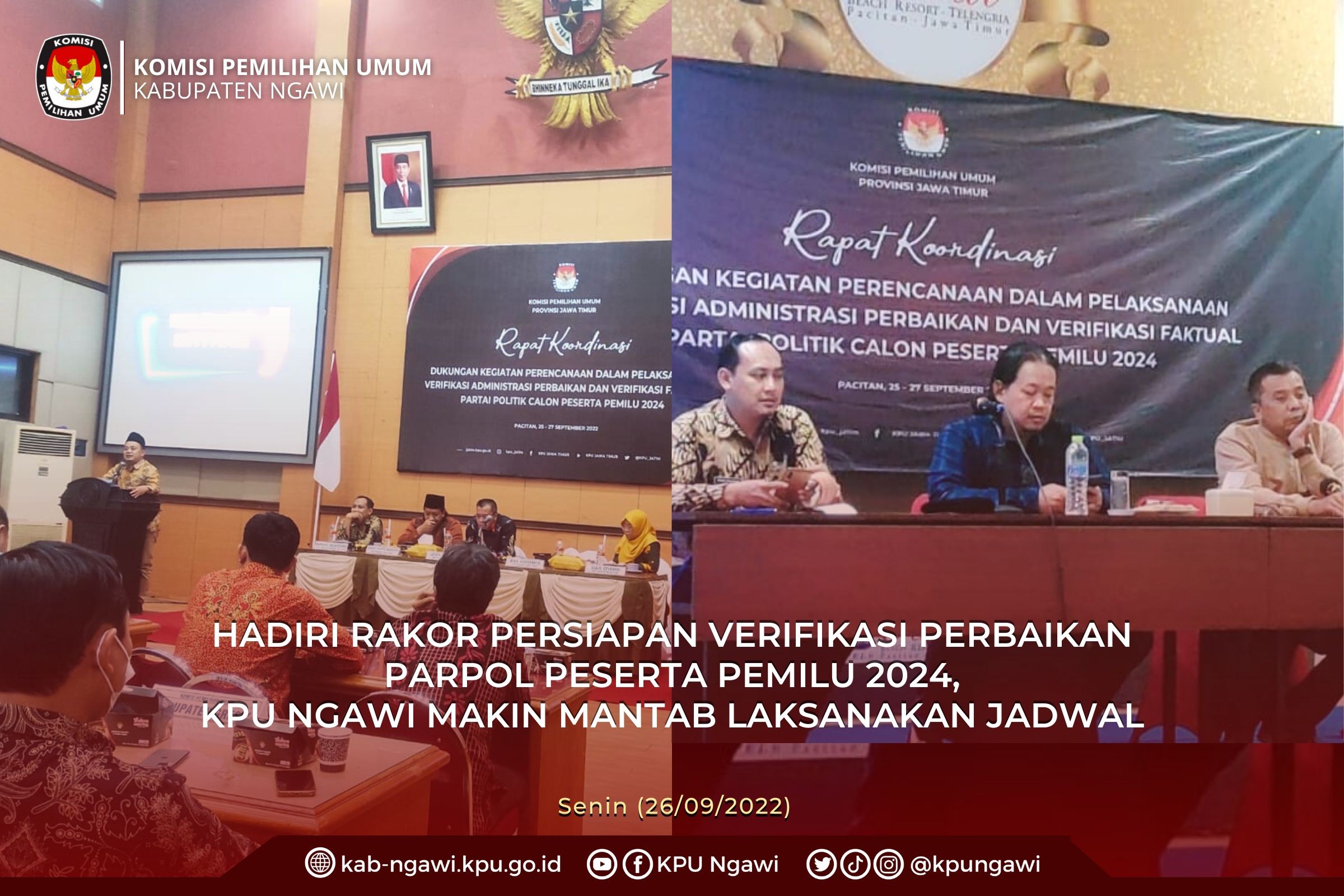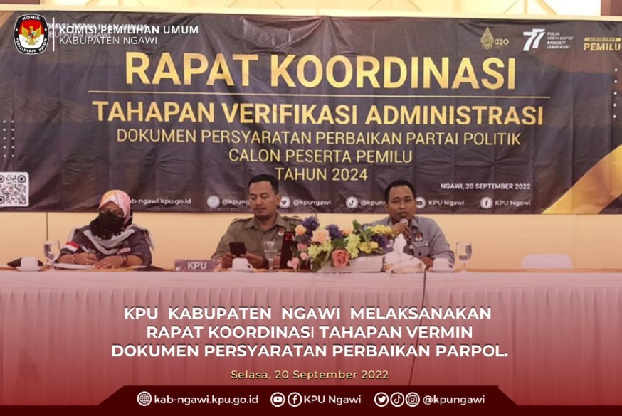 Pacitan, kab-ngawi.kpu.go.id - Kegiatan Rapat Koordinasi (Rakor) Dukungan Kegiatan Perencanaan dalam Pelaksanaan Verifikasi Administrasi Perbaikan dan Verifikasi Faktual Partai Politik (Parpol) Calon Peserta Pemilu 2024, merupakan kegiatan yang di selenggarakan oleh KPU Provinsi Jatim dalam rangka persiapan dan pelaksanaan tahapan verifikasi administrasi perbaikan keanggotaan partai politik calon pesrta pemilu tahun 2024. Aman Ridho Hidayat, Anggota KPU Kabupaten Ngawi bersama Kasubag Tekmas dan Admin SIPOL hadir mewakili KPU Kabupaten Ngawi dalam Rakor yang dilaksanan pada tanggal 25 – 27 September 2022 di Kabupaten Pacitan. Pembukaan rapat kordinasi yang dilaksanakan di di Gedung Karya Dharma Pemerintah Kabupaten Pacitan di hadiri oleh Pimpinan KPU Provinsi Jawa Timur, yaitu Komisioner Divisi Teknis Penyelenggaraan Insan Qoriawan, Komisioner Divisi Sosdiklih dan Parmas Gogot Cahyo Baskoro, serta Komisoner Divisi Hukum dan Pengawasan Muhammad Arbayanto. Dalam sambutan pembukaanya, Pak Arbayanto menyampaikan beberapan hal. “Tahapan vermin awal yang sudah sama-sama kita laksanakan, kita sudah menghadapi berbagai macam dinamika, terutama dalam hal dinamisnya regulasi, tentu ini butuh penanganan yang baik agar tahapan bisa dilaksanakan dengan baik pula.” Beliau juga menyampaikan harapannya “Dengan beratnya beban kerja ini, harapannya Divisi Teknis Penyelenggaraan selalu dalam performa yang terbaik untuk menghadapi putaran-putaran dalam proses kepemiluan berikutnya”. Komisioner KPU Kabupaten Ngawi Divisi Teknis Aman Ridho menyampaikan kesiapannya. “KPU Kabupaten Ngawi siap melanjutkan tahapan selanjutnya yaitu vermin perbaikan yang akan dimulai tanggal 1 Oktober 2022 nanti, kita akan mermpersiapkan semaksimal mungkin dalam hal pelaksanaan tahapan ini nanti, dengan lebih efektif dan efisien, karena tahapan tersebut jadwalnya lebih singkat atau lebih pendek harinya. Dengan Mengevaluasi Tahapan Vermin Awal, Pelaksanaan Vermin Perbaikan Bisa Lebih Fokus Pada Regulasi yang Berlaku. Rapat Koordinasi hari ke2 Senin (26/09/2022) Dukungan Kegiatan Perencanaan dalam Pelaksanaan Verifikasi Administrasi Perbaikan dan Verifikasi Faktual Partai Politik (Parpol) Calon Peserta Pemilu 2024 di Pacitan, dipimpin dan dipandu oleh Komisioner KPU Jatim Divisi Teknis Penyelenggaraan, Insan Qoriawan. Dalam forum ini lebih banyak dengan metode tanya jawab serta berbagi pengalaman dari masing-masing KPU Kabupaten/Kota pada pelaksanaa verifikasi administrasi tahapn awal yang sudah sama-sama dilaksanakan. Disampaikan oleh Pak Insan, bahwa instruksi ataupun petunjuk yang harus diperhatikan dan dijadikan acuan adalah yang bersumber dari pimpinan KPU Propinsi ataupun KPU RI, bukan dari sumber yang lain. Dituturkan pula, bahwa vermin perbaikan ini jadwal dan tahapan nya akan lebih singkat, untuk itu ketepatan waktu, update segala regulasi, memahami mekanisme dan prosedur, belajar dari pengalaman vermin sebelumnya. (Humas KPU Ngawi, ARH)