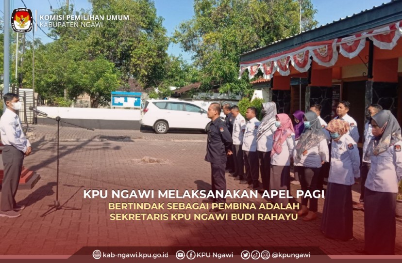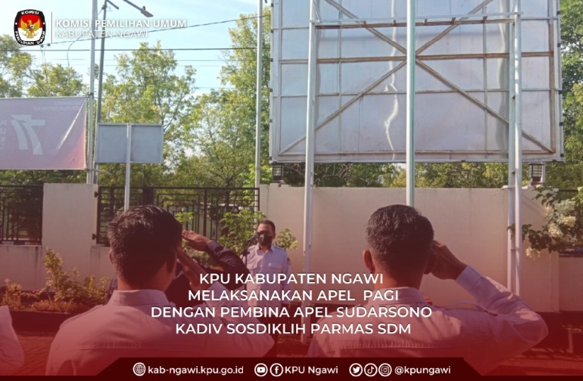 Ngawi, kab-ngawi.kpu.go.id - Dalam rangka meningkatkan kedisiplinan dan rasa tanggung jawab dan kinerja kelembagaan, jajaran KPU Kabupaten Ngawi kembali melaksanakan apel pagi. Pembina apel pada Senin (12/09/2022) adalah Sudarsono Anggota KPU kabupaten NGAWI Kadiv Sosiasialisasi Pendidikan Pemilih Partisipasi Masyarakat dan Sumber Daya Manusia. Pada apel yang dilakukan mulai pukul 08.00 WIB tersebut Sudarsono berpesan tentang pentingnya menjaga ritme kerja sehingga kegiatan berjalan dengan baik namun kesehatan juga terjaga. “adanya personil kita yang sakit, harus menjadi pengingat kita, agar saat merasa butuh istirahat maka segeralah ambil waktu istirahat. Jangan memaksakan diri. Kita tahu bahwa tahapan akan semakin padat. Maka waktu rehat gunakan sevcara maksimal, agar dijam kerja betul-betul bisa maksimal untuk bekerja.” pesan Sudarsono. Pembina apel menambahkan, apel menjadi wahana untuk menjaga kinerja dan disiplin dari seluruh jajaran, serta bersama menyempatkan berdoa diawal pekan untuk kelancaran tugas bersama. Apel pagi sendiri merupakan intruksi dari KPU RI melalui Surat Edaran No. 1 Tahun 2017 yang ditetapkan pada tanggal 20 Februari 2017 tentang pelaksanaan apel pagi setiap hari senin. (HumasKPUNgawi/Bw).