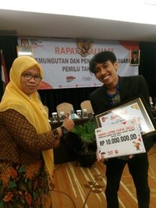 Ngawi, kab-ngawi.kpu.go.id, – Komisi Pemilihan Umum Kabupaten Ngawi melaksanakan penyerahan hadiah untuk pemenang lomba jingle maskot Pemilihan Bupati dan Wakil Bupati Ngawi Tahun 2020. Kegiatan dilaksanakan pada Kamis (19/12/2019) disela kegiatan evaluasi tahapan Pemilu di Aston Madiun. Pemenang desain maskot adalah Situr Kuswantoso, yang menjadi pemenang dari 25 karya desain yang ikut kompetisi. Adapun untuk pemenang jingle adalah Sodiq Wardoyo, ia memenangkan kompetisi dari 10 peserta. Kedua pemenang mendapatkan hadiah masing-masing Rp. 10 Juta rupiah serta sertifikat pemenang lomba. Penyerahan hadiah lomba, diserahkan oleh Prima Aequina Sulistyanti, S.IP Ketua KPU Kabupaten Ngawi. Dengan disaksikan jajaran komisioner sekretaris, serta staff KPU kabupaten Ngawi. Ketua KPU yang akrab disapa Bu Prima mengungkapkan bahwa penyerahan hadiah rencana semula dilaksanakan saat launching Pilbup, namun dengan berbagai pertimbangan, maka penyerahan dimajukan. Ini sebagai langkah apresiasi atas prestasi karya jingle dan maskot Pemilihan Bupati dan Wakil Bupati Ngawi Tahun 2020. (hupmas-bimo w)