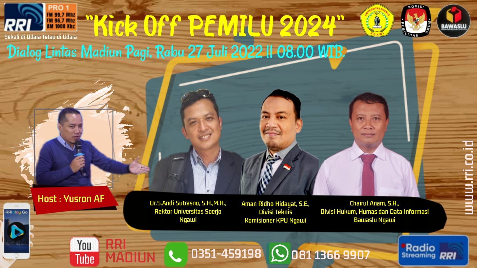 Ngawi, kpu-ngawi.kpu.go.id – Tahapan Pemilu 2024 telah diluncurkan pada 14 Juni 2022 lalu. Sedangkan untuk Jadwal pendaftaran Partai Politik akan dilaksanakan tanggal 1- 14 Agustus 2022. Untuk itu, KPU Ngawi menyiapkan petugas Helpdes Sipol, khusus untuk memberikan pelayanan Layanan Pendaftaran Parpol mulai 27 Juli 2022. Hal tersebut disampaikan oleh anggota KPU Ngawi Aman Ridho Hidayat, saat menjadi narasumber dalam Talkshow RRI Madiun bertema Kick Off Pemilu 2024 (Selasa, 27 Juli 2022). Dalam program lintas Madiun Pagi yang dilaksanakan pukul 08.00-09.00 WIB tersebut hadir pula Chairul Anam Divisi Hukum Humas dan Data Informasi Bawaslu Kab. Ngawi dan S. Andi Sutrasno Rektor Universitas Soerjo Ngawi. Aman Ridho Hidayat menyampaikan bahwa pihaknya telah mengikuti Bimbingan teknis terkait pendaftaran Partai Politik yang dilaksanakan KPU RI. Dengan demikian ini memastikan bahwa tahapan awal Pemilu sudah dimulai dan tidak ada lagi penundaan lagi. “ Tahun 2024 menjadi tonggal awal dimulainya keserentakan pelaksanaan Pemilu juga Pemilihan ditahun yang sama.” ujar Ridho. Sementara itu, Andi Sutrasno Pengamat Politik yang juga Rektor Universitas Soerjo menyampaikan pentingnya mengantisipasi kerawanan atau pelanggaran dalam tahapan termasuk pendaftaran Parpol. Andi menyampaikan bahwa tantangan dan bentuk kerawanan juga mengikuti perkembangan jaman. Saat penggunaan berkas sudah mulai minim, dan ada optimalisasi penggunaan aplikasi maka potensi kerawan juga demikian. Dalam hal ini, Andi menyarakan agar lembaga penyelenggara pusat harus melakukan sistem penguatan pengamanan aplikasi. Sedangkan untuk di penyelenggara daerah perlu melakukan sosialisasi yang baik. Pada TalkShow yang dipandu Yusron Alfalah, Chairul Anam Divisi Hukum Humas dan Data Informasi Bawaslu Kab. Ngawi kembali mengajak masyarakat untuk bersama mengawasi tahapan dalam Pemilu. “Mari bersama awasi pemilu bersama BAWASLU dengan senyum dengan riang.” Pesan Anam. (Humas KPU Ngawi)