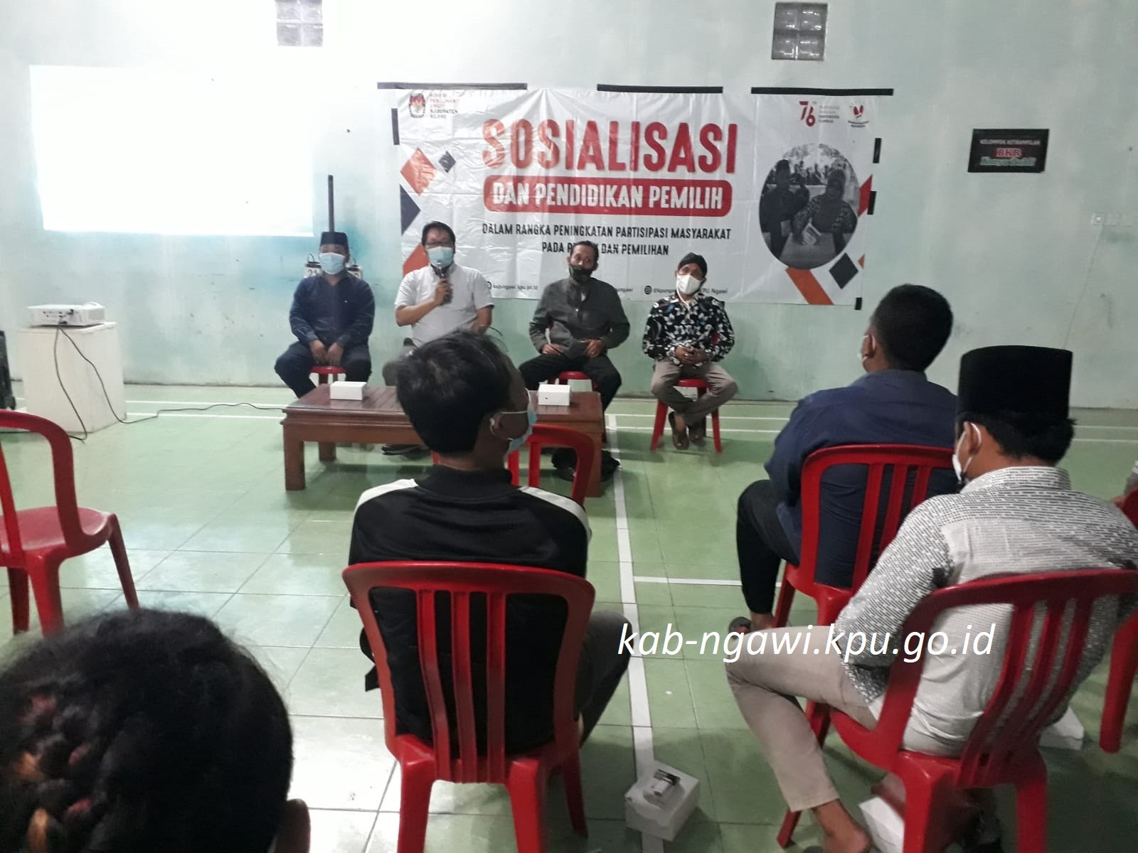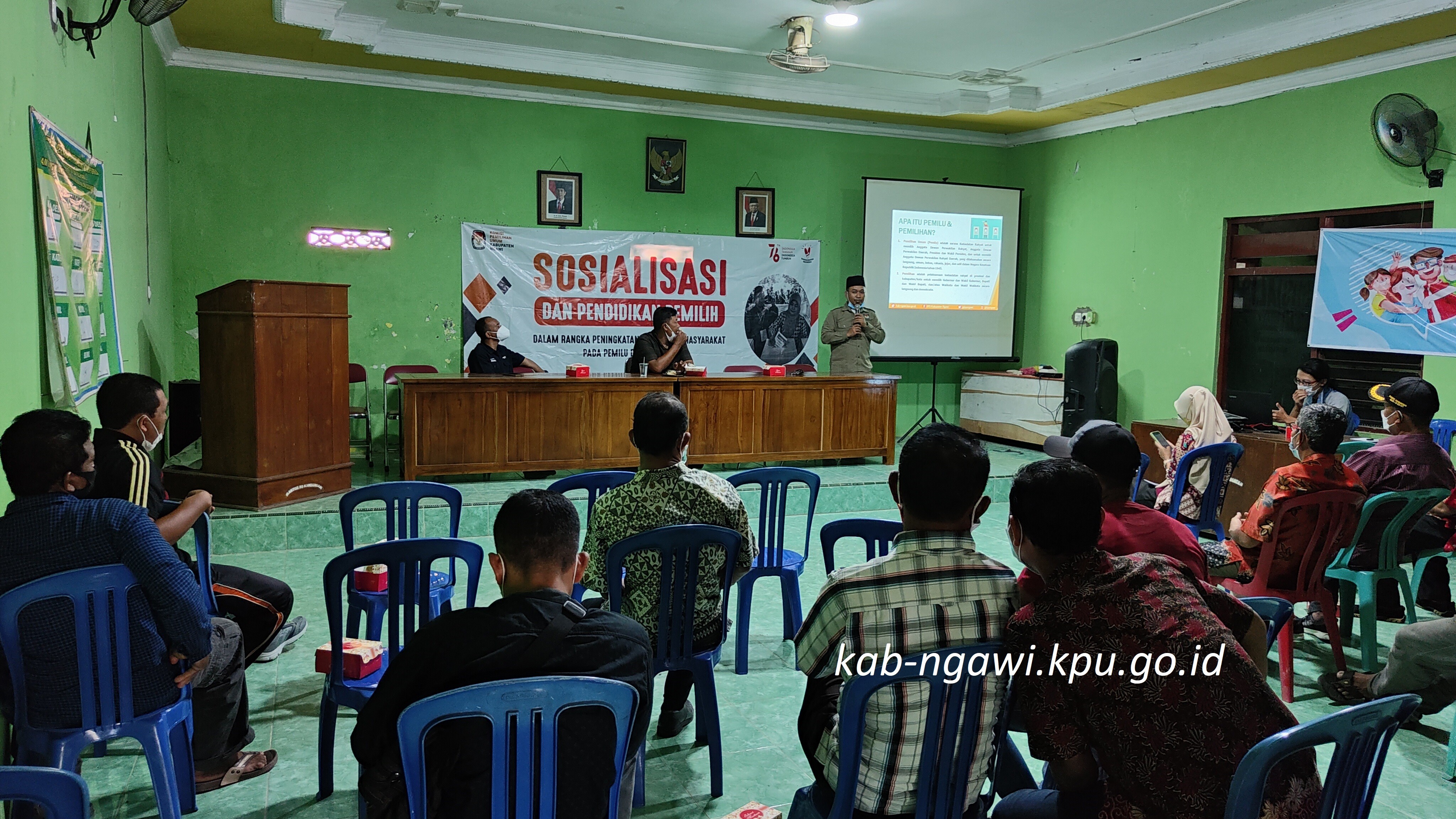 Ngawi, kab-ngawi.kpu.go.id – Kamis (7/10/2021) KPU Kabupaten Ngawi melaksanakan kegiatan Sosialisasi dan Pendidikan Pemilih bertempat di Desa Ngancar mulai pukul 20.00 WIB. Putra Adi Wibowo SW, Anggota KPU Kabupaten Ngawi memberikankan sambutan pada awal kegiatan. Mewakili ketua KPU Ngawi, pihaknya berharap partisipasi pemilih terus meningkat dari pemilu ke pemilu. Menurutnya, Pemilu menjadi wadah warga negara untuk menyalurkan aspirasi sosok pemimpin dan wakil di legeslatif. Dalam kegiatan Pendidikan pemilih itu, mengetengahkan dua pemateri. Sudarsono (Divisi Sosialisasi, Pendidikan Pemilih, Parmas dan SDM). Dalam materinya ia menyampaikan tentang langkah menjadi pemilih yang cerdas. Diantaranya memahami tujuan pemilihan serta mengetahui profil peserta pemilu. Sudarsono mengingatkan bahwa menjadi pemilih cerads dimulai dari diri sediri, kemudian keluarga dan masyarakat sekitar. Sementara itu, pemateri kedua Miftakhul Huda dari Prasasti Nusantarra menyampaikan tentang ajakan agar warga bisa melek politik. Terlebih kaum muda yang sangat diperlukan kiprahnya, sehingga bisa mengisi ruang dalam perpolitikan. Ini menurutnya, dimulai dari pribadi yang cerdas dalam memiliki dan berani mengkritisi hal-hal yang kurang memihak pada masyarakat. (Humas KPU Ngawi)