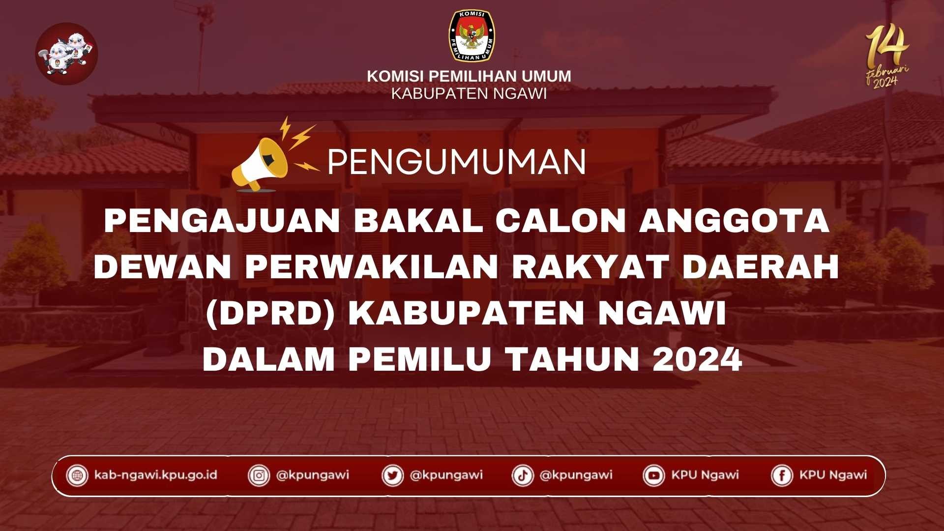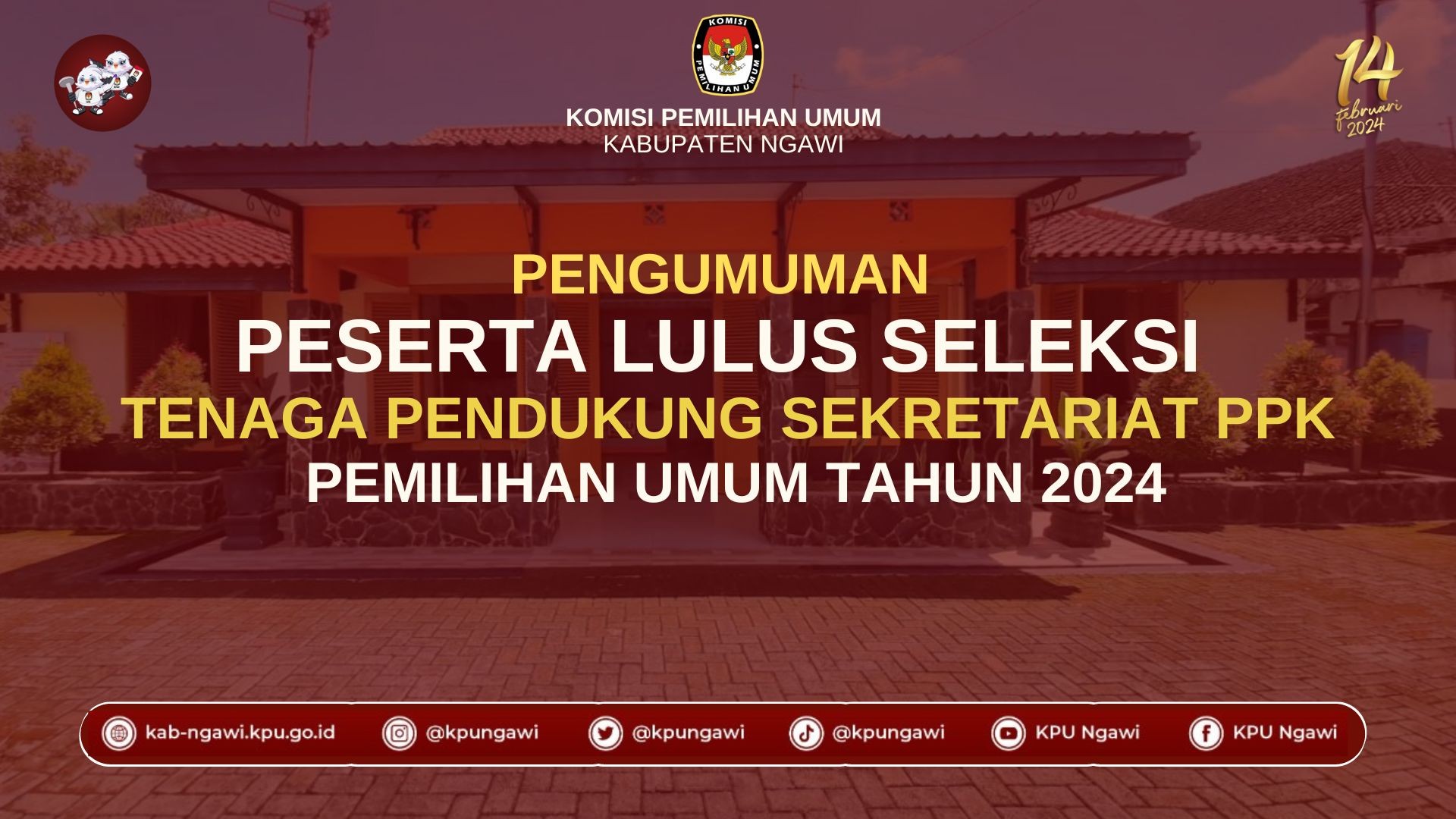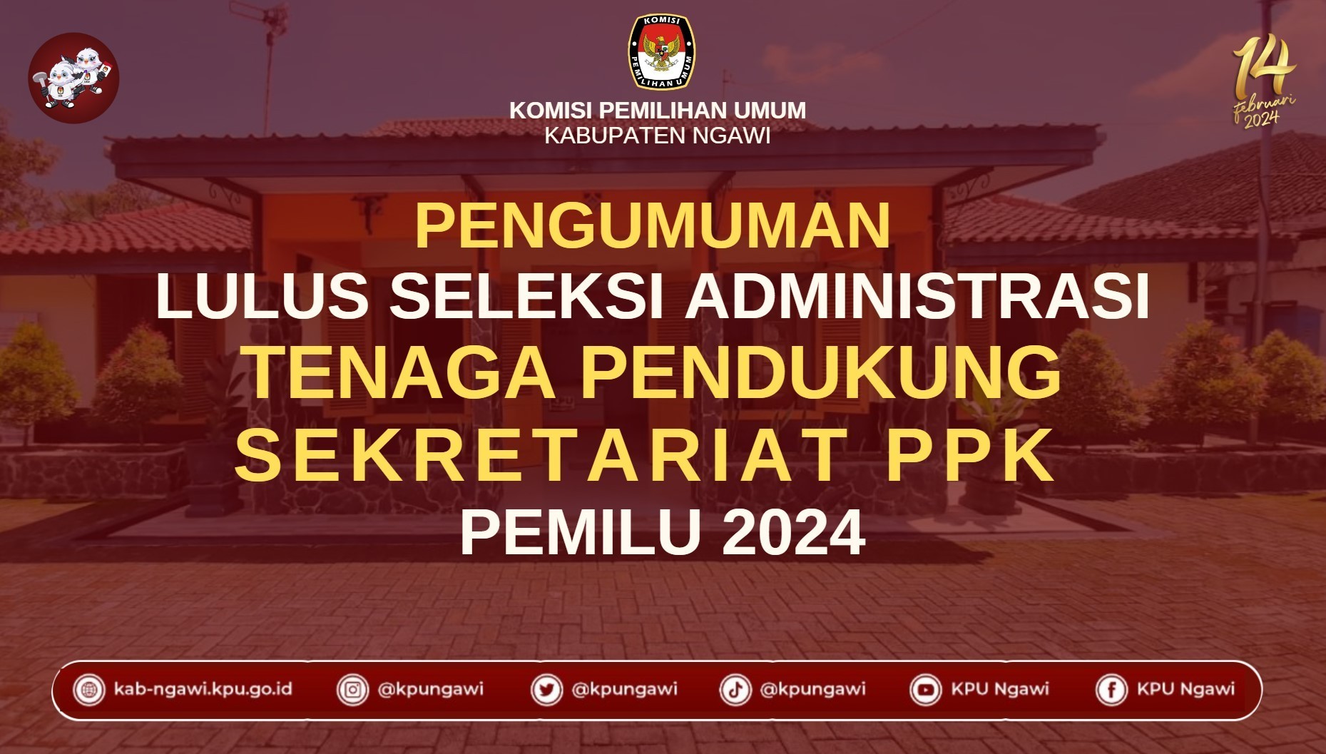 KPU Kabupaten Ngawi menyampaikan Pengumuman Nama-nama peserta yang dinyatakan lulus Seleksi Administrasi Tenaga Pendukung PPK pada Sekretariat KPU Kabupaten Ngawi untuk Pemilu Tahun 2024.