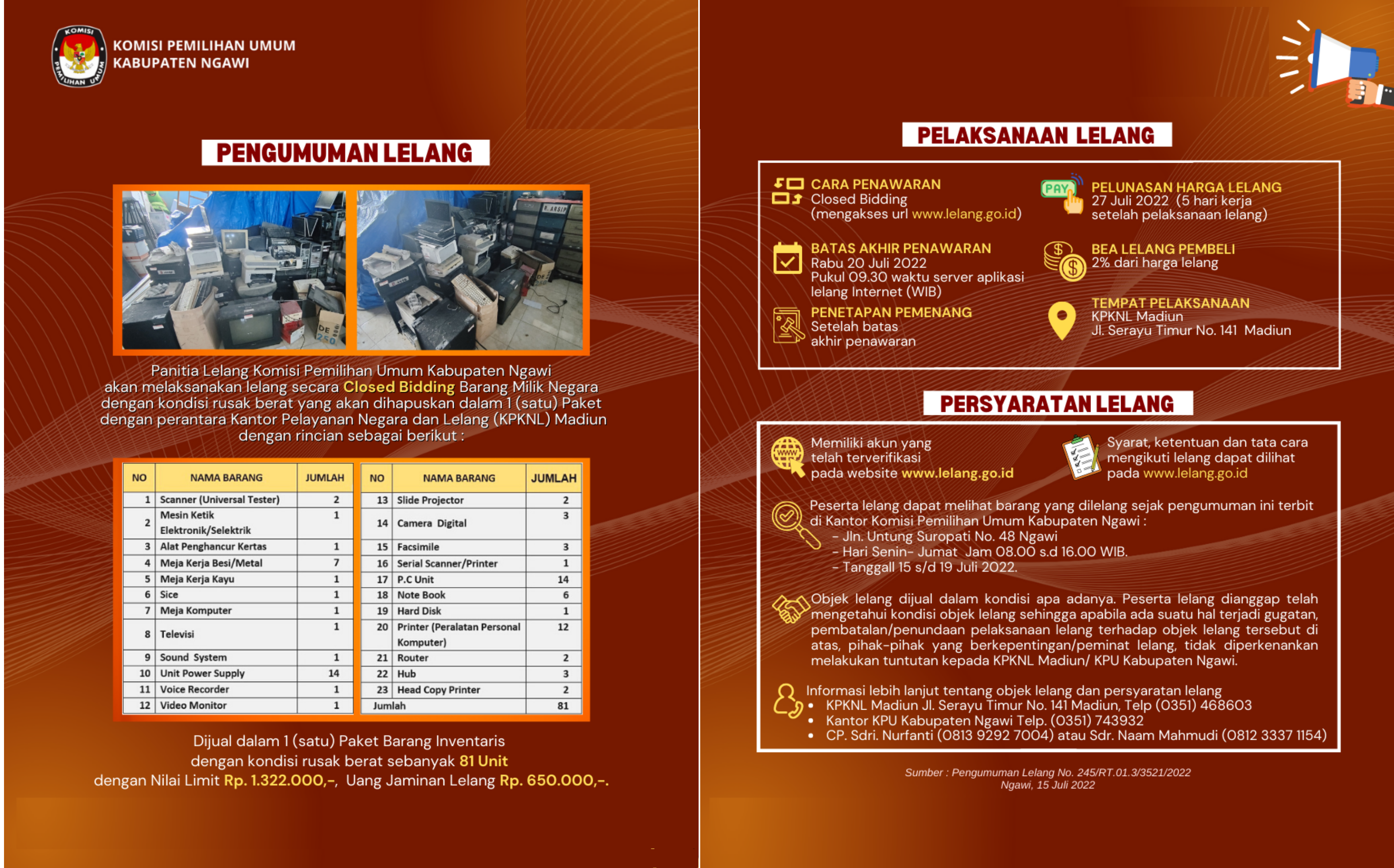 Panitia Lelang Komisi Pemilihan Umum Kabupaten Ngawi akan melaksanakan lelang secara Closed Bidding Barang Milik Negara dengan kondisi rusak berat yang akan dihapuskan dalam 1 (satu) Paket dengan perantara Kantor Pelayanan Negara dan Lelang (KPKNL) Madiun. Adapun diantara barang yang dilelang meliputi : NO NAMA BARANG JUMLAH 1 Scanner (Universal Tester) 2 2 Mesin Ketik Elektronik/Selektrik 1 3 Alat Penghancur Kertas 1 4 Meja Kerja Besi/Metal 7 5 Meja Kerja Kayu 1 6 Sice 1 7 Meja Komputer 1 8 Televisi 1 9 Sound System 1 10 Unit Power Supply 14 11 Voice Recorder 1 12 Video Monitor 1 13 Slide Projector 2 14 Camera Digital 3 15 Facsimile 3 16 Serial Scanner/Printer 1 17 P.C Unit 14 18 Note Book 6 19 Hard Disk 1 20 Printer (Peralatan Personal Komputer) 12 21 Router 2 22 Hub 3 23 Head Copy Printer 2 JUMLAH 81 Barang sejumlah 81 uniut tersebut, dijual dalam 1 (satu) Paket Barang Inventaris dengan kondisi rusak berat, dengan nilai limit Rp. 1.322.000,-, dengan Uang jaminan Lelang Rp. 650.000,-. Pelaksanaan lelang : Cara penawaran melalui metode Closed Bidding (dengan mengakses url www.lelang.go.id).Batas akhir penawaran pada hari Rabu / 20 Juli 2022 pukul 09.30 waktu Server Aplikasi Lelang Melalui Internet (sesuai WIB) Penetapan Pemenang dilaksanakan setelah batas akhir penawaranPelunasan harga lelang pada 5 (lima) hari kerja setelah pelaksanaan lelang (27/07/2022) Bea Lelang Pembeli 2% dari harga lelang Tempat Pelaksanaan di KPKNL (Kantor Pelayanan Kekayaan Negara dan Lelang) Madiun Jalan Serayu Timur Nomor 141 Madiun. Persyaratan lelang: Memiliki akun yang telah terverifikasi pada website www.lelang.go.id Syarat dan ketentuan serta tata cara mengikuti lelang dapat dilihat pada alamat website di atas. Peserta lelang dapat melihat barang yang dilelang sejak pengumuman ini terbit di Kantor Komisi Pemilihan Umum Kabupaten Ngawi, Jln. Untung Suropati No. 48 Ngawi pada hari dan jam kerja (08.00 s.d 16.00 WIB) dari tanggal 15 s/d 19 Juli 2022. Objek lelang dijual dalam kondisi apa adanya. Peserta lelang dianggap telah mengetahui kondisi objek lelang sehingga apabila ada suatu hal terjadi gugatan, pembatalan/penundaan pelaksanaan lelang terhadap objek lelang tersebut di atas, pihak-pihak yang berkepentingan/peminat lelang tidak diperkenankan melakukan tuntutan kepada KPKNL Madiun / KPU Kabupaten Ngawi. Informasi lebih lanjut tentang objek lelang dan persyaratan lelang dapat menghubungi : KPKNL Madiun Jl. Serayu Timur No. 141 Madiun, Telp (0351) 468603 Kantor KPU Kabupaten Ngawi di nomor (0351) 743932 Sdr. Nurfanti (0813 9292 7004) dan Sdr. Naam Mahmudi (0812 3337 1154). Pengumuman Bisa diunduh dengan klik berikut :