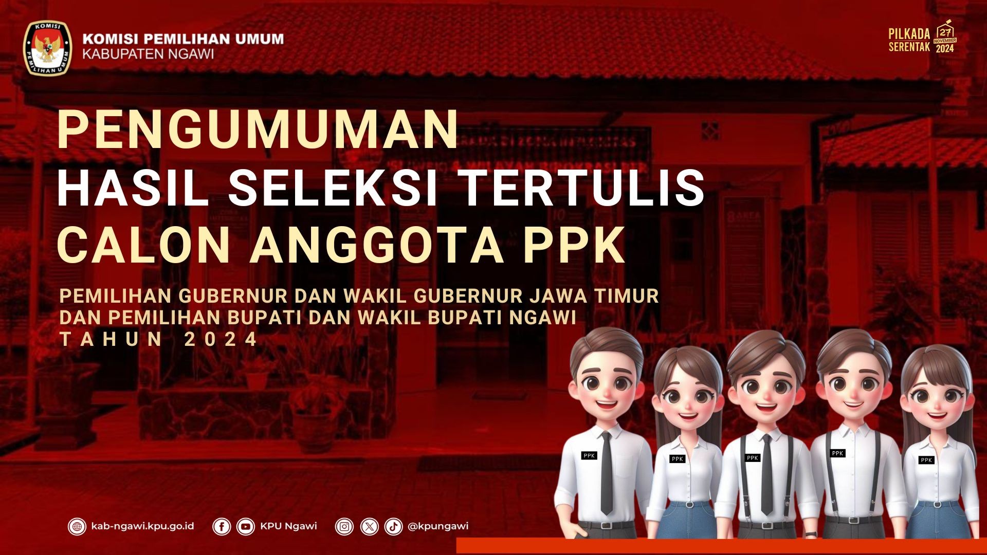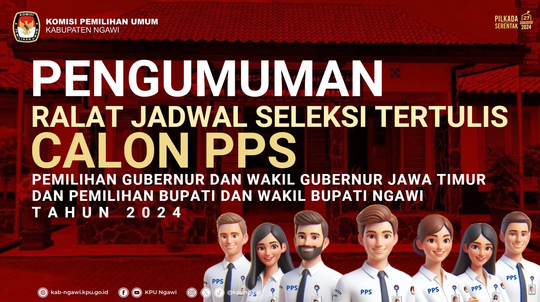 Sehubungan dengan hal tersebut di atas, Komisi Pemilihan Umum Kabupaten Ngawi mengundang calon anggota Panitia Pemungutan Suara yang dinyatakan Memenuhi Syarat untuk hadir dan mengikuti Seleksi Tertulis Calon Anggota Panitia Pemungutan Suara pada: