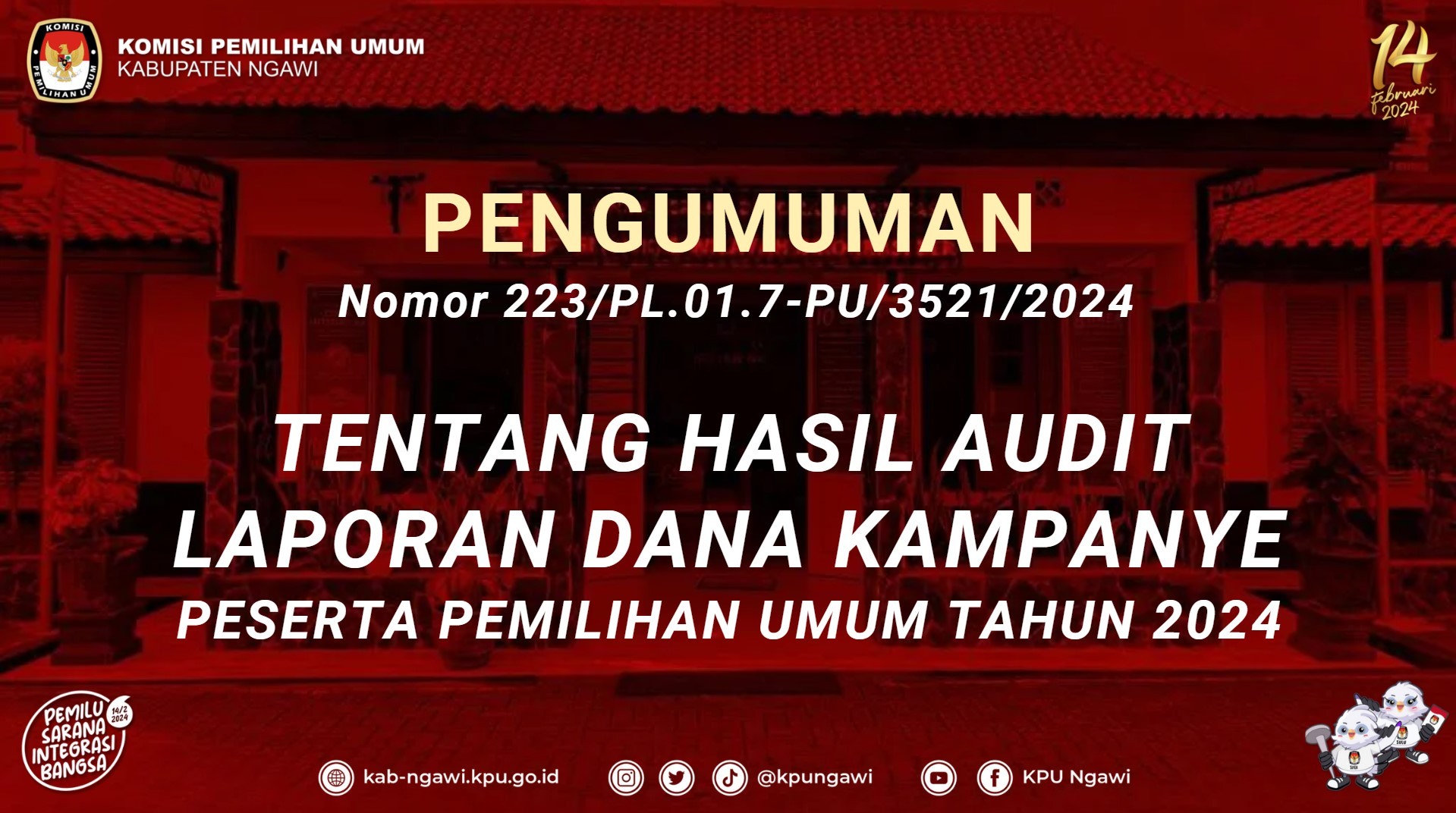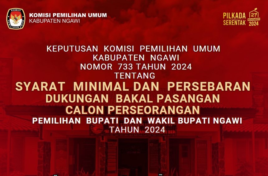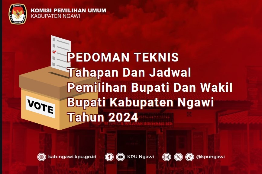 Pada hari Sabtu (20/01/2024), Komisi Pemilihan Umum Kabupaten Ngawi telah melaksanakan Rapat Pleno membahas tentang Penetapan Jadwal Kampanye Pemilihan Umum Melalui Metode Rapat Umum Partai Politik Untuk Pemilihan Umum Anggota Dewan Perwakilan Rakyat Daerah Kabupaten Ngawi dalam Pemilihan Umum Tahun 2024.