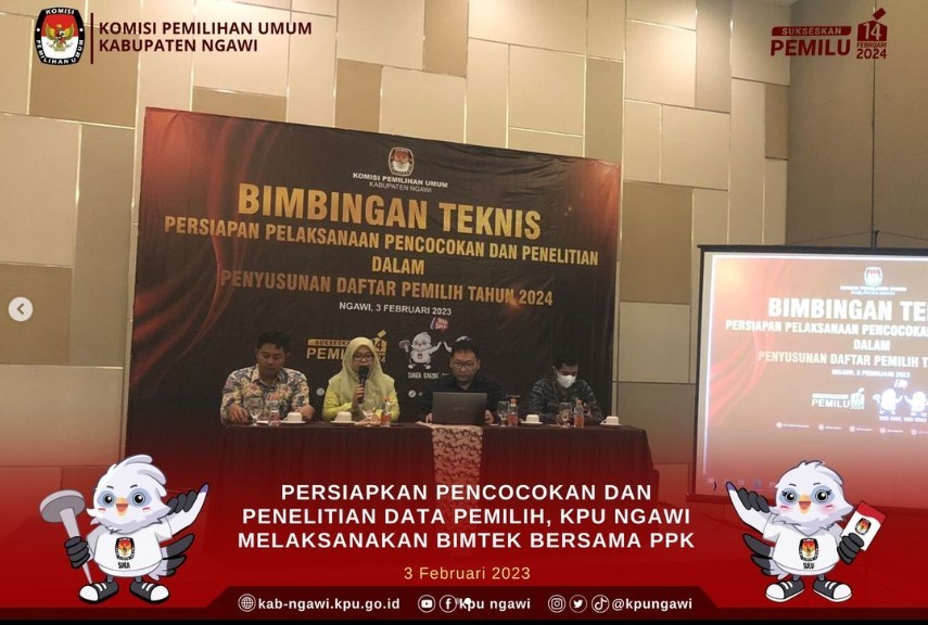 Ngawi, kab-ngawi.kpu.go.id - Dalam rangka persiapan Coklit, KPU Ngawi melaksanakan Bimtek Bersama Panitia Pemilihan Kecamatan. Bimtek terkait Pencocokan dan Penelitian Dalam Penyusunan Daftar Pemilih Pemilu Tahun 2024.