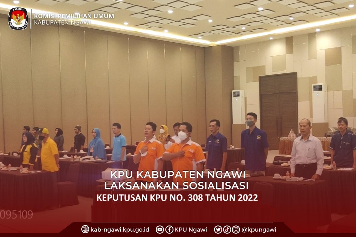Ngawi, kab-ngawi.kpu.go.id – KPU Ngawi melaksanakan Sosialisasi Keputusan Komisi Pemilihan Umum No.308 Tahun 2022 kegiatan bertempat di Kurnia Convention Hall.