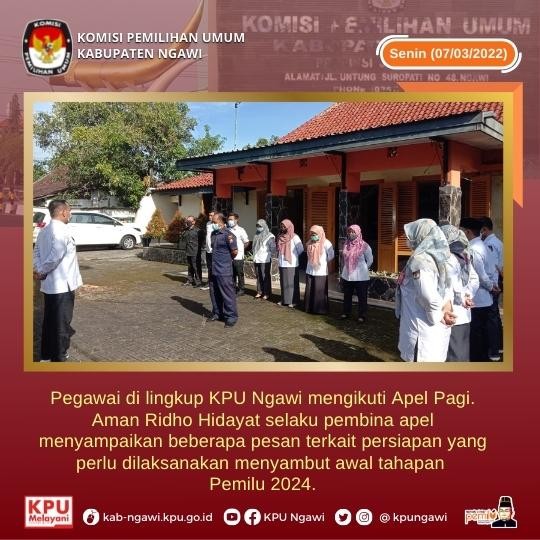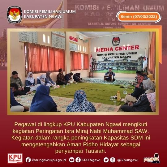 Ngawi, kab-ngawi.kpu.go.id - KPU Kabupaten Ngawi melaksanakan kegiatan Peningkatan Kapasitas SDM seiring Peringatan Isro Mi’raj Nabi Muhammad SAW. Kegiatan dilaksanakan pada Selasa 8 Maret 2022 dimulai pukul 09.30 WIB. Ketua KPU Ngawi Prima Aequina Sulistyanti, menyampaikan harapan agar acara bisa dilaksanakan dengan rutin dan menjadi bagian upaya meningkatkan kualitas SDM di lingkup KPU Kabupaten Ngawi. Sementara itu, Aman Ridho Hidayat, dalam tausiah Kajian Hikmah Peringatan Isra' Mi'raj Nabi Muhammad SAW. menyampaikan bahwa antara bekerja dan beribadah, memiliki keterkaitan yang erat. Bekerja dengan niat bersih dan bermuara pada pengharapan ridho Allah, maka bekerja menjadi bagian dari ibadah seorang hamba. "Bekerja dengan mengharap ridho Allah, adalah ibadah. Ini merupakan jenis ibadah umum. Dimanaun seseorang bekerja, termasuk dibawah naungan lembaga pemerintahan, juga bisa bernilai ibadah" urai Ridho. Kajian tersebut dilaksanakan dalam rangka peningkatan kapasitas SDM di lingkup KPU Kabupaten Ngawi. Adapun tema yang diambil adalah "Dengan Isra' Mi'raj Menjadi Generasi Hebat, Berkarakter dan Bertaqwa". Kegiatan dilaksanakan di Media Center KPU Ngawi Selasa (08/03/2022) dengan diikuti oleh seluruh Komisioner, Sekretaris dan pegawai di lingkup Kantor KPU Kabupaten Ngawi.