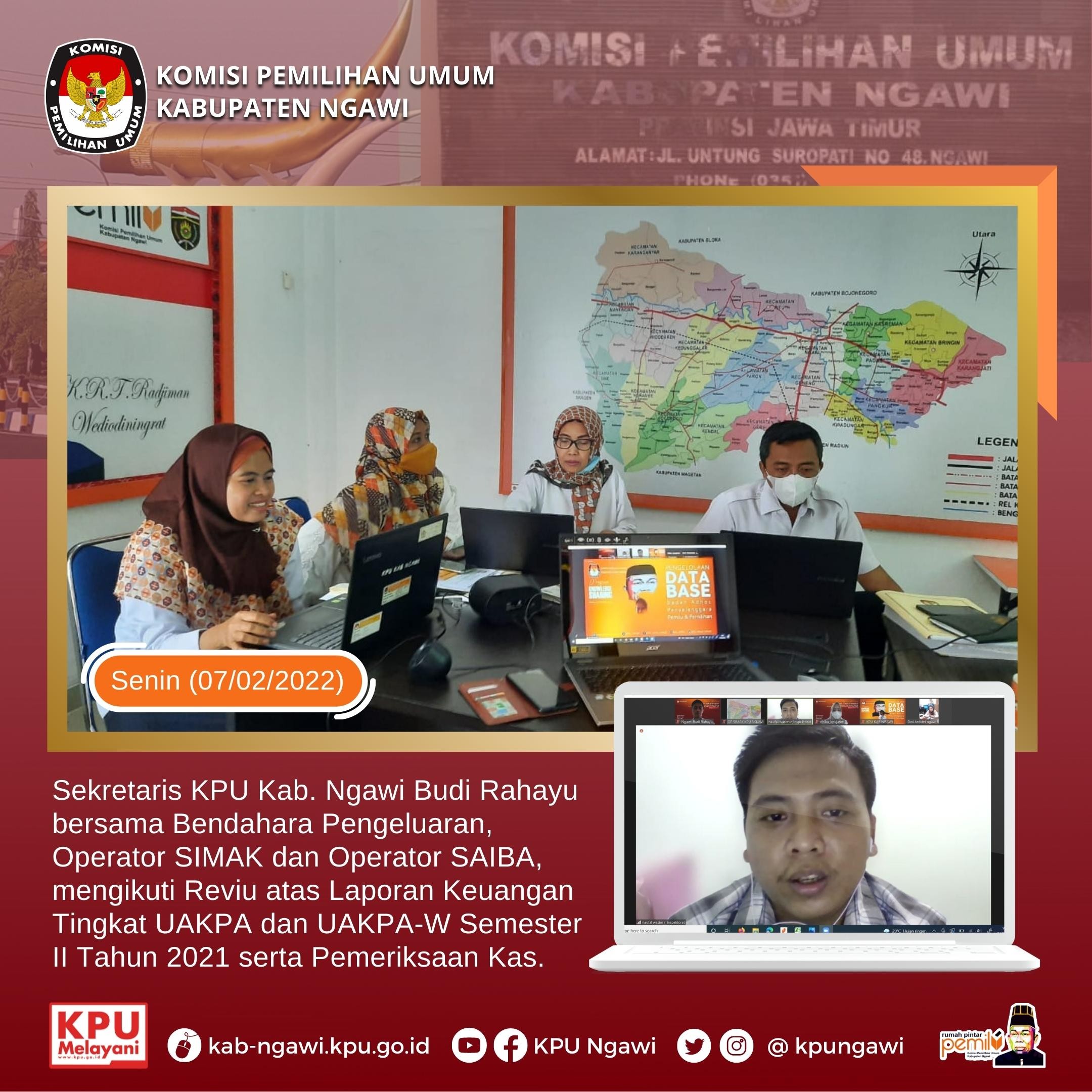 Ngawi, kab-ngawi.kpu.go.id - Sekretaris KPU Kabupaten Ngawi Budi Rahayu pada Senin (7/2/2022) menghadiri undangan Sekretaris KPU Provinsi Jawa Timur untuk melaksanakan Reviu atas Laporan Keuangan Tingkat UAKPA dan UAKPA-W Semester II Tahun 2021 serta Pemeriksaan Kas. Acara yang dilaksanakan secara daring (dalam jaringan) melalui aplikasi zoom meeting tersebut, dimulai pada pukul 10.00 WIB.