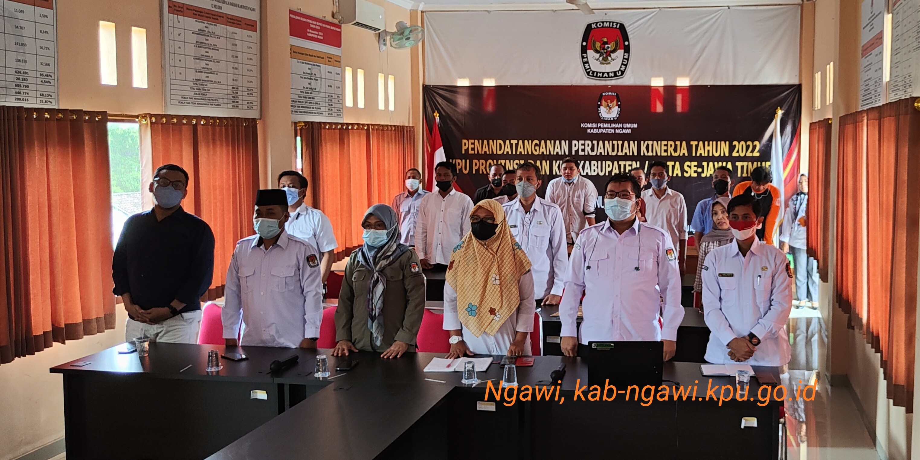 Ngawi, kab-ngawi.kpu.go.id – Pada Kamis (13/01/2022), seluruh pegawai di lingkup Kantor Komisi Pemilihan Umum Kabupaten Ngawi mengikuti kegiatan Penandatanganan Perjanjian Kinerja Tahun 2022 yang dilaksanakan KPU Provinsi serta KPU Kabupaten/Kota se-Jawa Timur. Acara yang dilaksanakan secara virtual melalui zoom meeting dimulai pada 09.30 WIB. Jajaran pegawai di KPU Ngawi mengikuti acara di ruang media Center Jalan Untung Suropati Ngawi. Ketua KPU Provinsi Jawa Timur, Choirul Anam dalam pengantarnya menekankan pentingnya kualitas kinerja seluruh jajaran, baik KPU provinsi hingga Kabupaten Kota. Baik dalam tata Kelola administrasi kepegawaian, tata kelola keuangan serta kehumasan. Ketua KPU Provinsi Jatim sempat menyebutkan beberapa prestasi KPU Provinsi yang telah diraih jajarannya, termasuk satker terbaik pertama dalam tata kelola keuangan. Untuk itu, pihaknya meminta KPU Kabupaten/Kota untuk juga melakukan pengelolaan keuangan dengan baik. Sementara itu, dalam hal layanan informasi, Anam meminta jajaran hingga Kabupaten Kota, untuk meningkatkan akuntabilitas informasi publik. Selain itu juga berharap terus melakukan banyak perbaikan, profesional, transparan, bisa menjalin sinergitas dan kolaborasi secara internal hingga eksternal dengan stakeholder Pemilu Pemilihan. Penandatanganan Perjanjian Kinerja Tahun 2022 diawali oleh Ketua dan Sekretaris KPU Provinsi Jatim dilanjutkan secara serentak, dengan Penandatanganan Perjanjian Kinerja oleh Ketua dan Sekretaris KPU Kabupaten/Kota se-Jawa Timur, termasuk KPU Kabupaten Ngawi. Ketua KPU Kabupaten Ngawi Prima Aequina Sulistyanti dan Sekretaris KPU Kabupaten Ngawi Budi Rahayu menandatangani dokumen disaksikan oleh Seluruh Komisioner dan staf. Sekretaris KPU Provinsi Jatim, Nanik Karsini berharap penandatanganan Kinerja menjadi awal yang baik dalam membangun sinergitas dan semangat kerja. Selain itu, Bu Nanik menyebutkan bahwa, pada awal tahun ini, terdapat 402 orang PPNPN tenaga PPNPN (Pegawai Pemerintah Non Pegawai Negeri) dari seluruh Kabupaten/Kota yang bernanung dibawah KPU Provinsi. Kepada semua SDM, khususnya PPNPM Bu Nanik mengajak dengan diawali perjanjian kinerja serta penandatanganan Pakta Integritas, semua siap untuk bekerja dengan lebih baik. (hupmas/kpungawi/bimowe/dok davis trias)