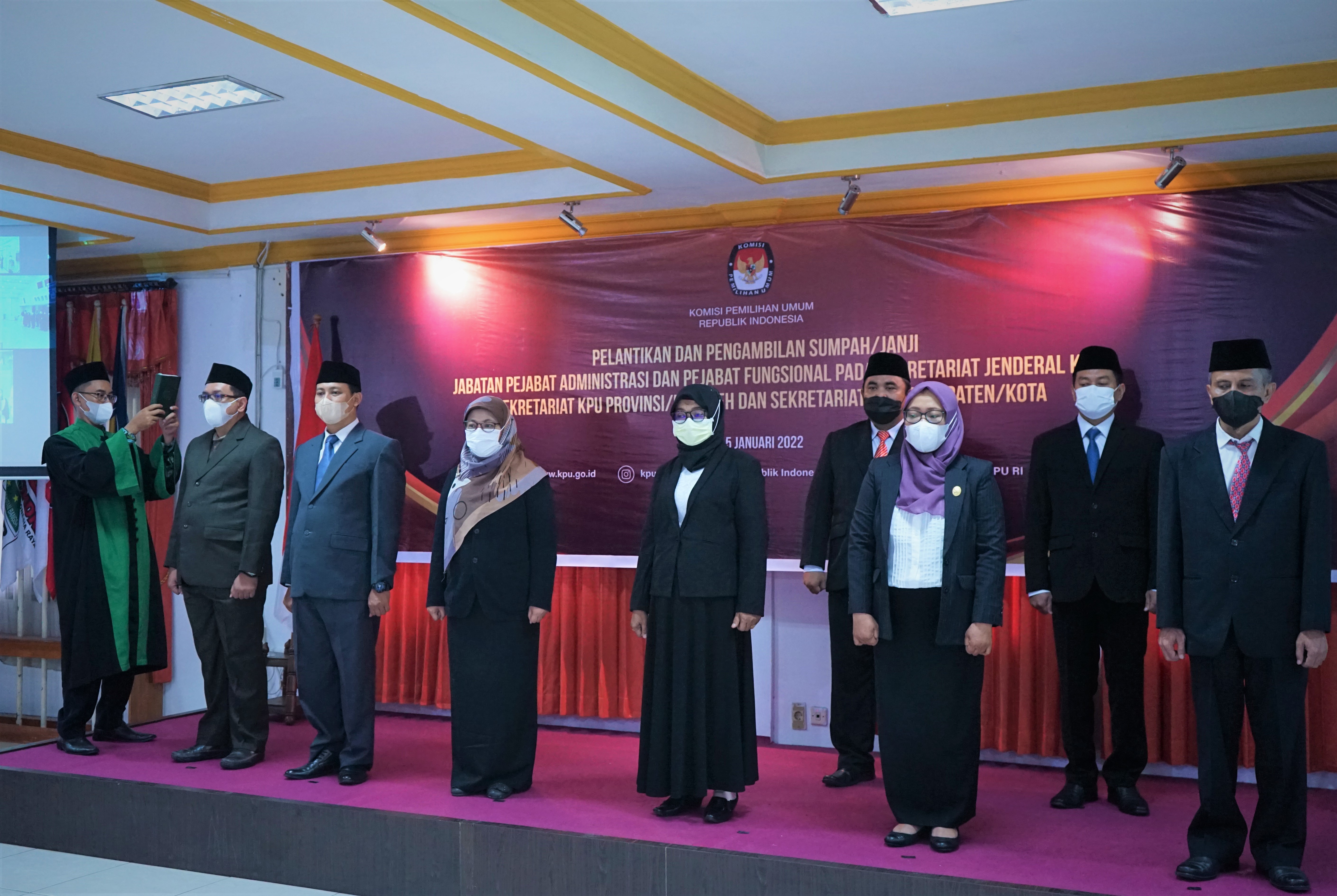 Jakarta, kpu.go.id - Sekretaris Jenderal Komisi Pemilihan Umum (KPU) RI Bernad Dermawan Sutrisno melantik 190 pejabat administrasi, pejabat fungsional pada Sekretariat Jenderal KPU, Sekretariat KPU Provinsi/KIP Aceh dan Sekretariat KPU Kabupaten/Kota se-Indonesia, Rabu (5/1/2022). Ke-190 pejabat yang dilantik terdiri dari 118 sebagai Kepala Bagian (Kabag), 61 pejabat dilantik sebagai sekretaris, 5 pejabat administrasi, dan 6 pejabat pengawas. Seluruh pejabat yang dilantik baik yang hadir secara luring dan daring mengucap sumpah dan janji yang dipimpin oleh Sekjen KPU RI. Dalam arahannya, Bernad menyampaikan bahwa pelantikan ini berdasarkan Keputusan KPU RI Nomor 12-15/SDM.05.5/04/2022 tanggal 4 Januari 2022. Selain itu pelantikan juga bagian dari implementasi PKPU 14 tahun 2020 tentang Tugas, Fungsi, Susunan Organisasi dan Tata Kerja (SOTK), terutama di tingkat sekretariat KPU Provinsi dan Kabupaten/Kota. "Jadi hari ini momentum yang baik sehingga ini mengingatkan kita semua bahwa implementasi PKPU 14 sudah dimulai dari pusat dan sekarang sudah masuk ke Provinsi, dan Kab/Kota," ucap Bernad. Bernad pun menyampaikan arahannya kepada masing-masing pejabat yang baru dilantik sebagai kepala bagian untuk bekerja menggunakan SOTK menyesuaikan diri dengan ritme ekosistem kerja yang baru sesuai PKPU 14. Bagi pejabat yang dilantik menjadi pejabat fungsional tata kelola pemilu ditingkat provinsi, dia berpesan agar menjalankan tugas dengan baik. Sementara itu, bagi fungsional madya tata kelola pemilu di provinsi agar dapat mengikuti ritme dan menyesuaikan pola kerja fungsional. Untuk para sekretaris yang dilantik, Bernad mengarahkan agar melakukan empat hal. Pertama, sekretaris agar melaporkan diri kepada Ketua dan Anggota KPU Kab/Kota masing-masing. Kedua, segera melakukan konsultasi anggaran kepada sekretaris KPU Provinsi masing-masing dan konsultasi program kegiatan pada masing-masing pleno Kab/Kota. Kemudian, para sekretaris juga diminta segera melakukan konsolidasi dengan kesekretariatan KPU Kab/Kota. Terakhir, Bernad mengatakan para sekretaris agar melakukan koordinasi dengan stakeholder. Menutup arahannya, Bernad mengucapkan selamat bagi para pejabat yang dilantik. Senada, Ketua KPU RI Ilham Saputra juga memberi ucapan selamat bagi para pejabat yang dilantik. Menurutnya, amanah yang diberikan kepada para pejabat ini tidak bisa dianggap enteng karena merupakan amanah yang besar dan dilantik atas nama Tuhan. Ilham juga meminta agar para pejabat yang dilantik membangun komunikasi yang baik dengan komisioner dan membangun kondusivitas di lingkungan kerja demi menyukseskan Pemilu dan Pemilihan 2024. "Membangun lingkungan kerja yang baik juga penting," ujar Ilham. Turut hadir, Ketua KPU RI Ilham Saputra, Anggota KPU RI Arief Budiman, Deputi Bidang Dukungan Teknis Eberta Kawima, Deputi Bidang Administrasi Purwoto Ruslan Hidayat, Inspektur Utama Nanang Priyatna dan para pejabat Eselon II Sekretariat Jenderal KPU RI serta jajaran KPU Provinsi/KIP Aceh dan KPU/KIP Kab/Kota Se-Indonesia. (humas kpu ri tenri/ foto: dosen/ed diR)