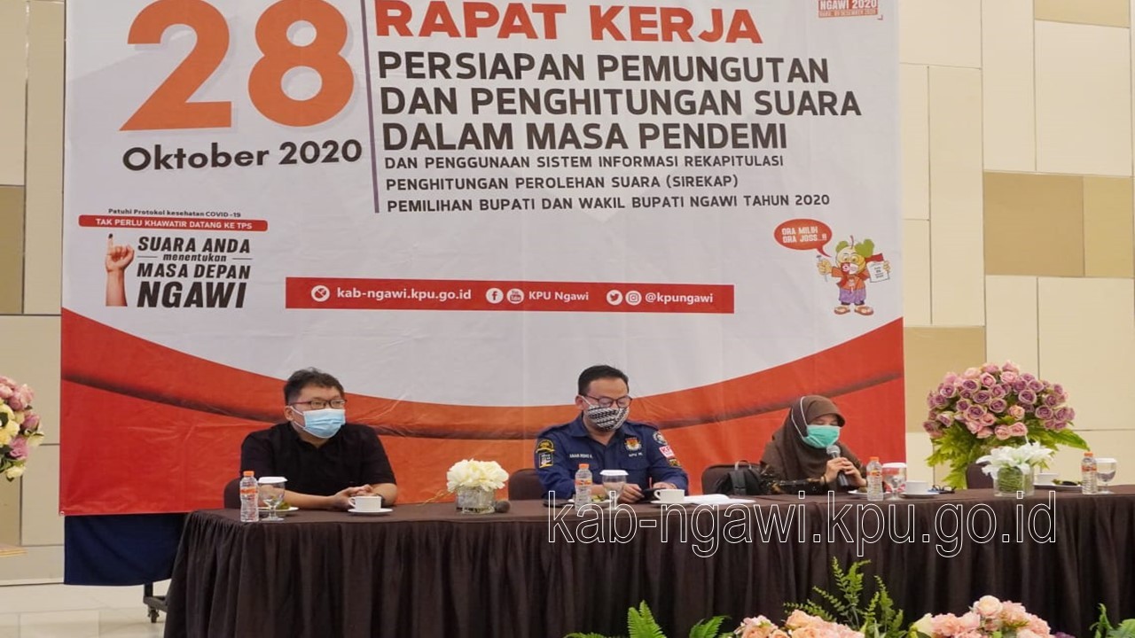 Ngawi, kab-ngawi.kpu.go.id – Pada Pemilihan Serentak 2020, KPU RI menyiapkan Sistem Informasi Rekapitulasi berbasis online. Sarananya adalah aplikasi yang akan dioperasikan oleh KPPS dari Tempat Pemungutan Suara (TPS). Dimana terdapat seorang petugas KPPS yang akan mendokumentasikan secara khusus formulir model C.KWK atau Plano berisi data perolehan suara pasangan calon. Hasil dokumentasi tersebut, kemudian diunggah melalui aplikasi yang disebut SIREKAP. Nurul Amalia anggota KPU Provinsi Jatim menyampaikan bahwa aplikasi SIREKAP menjadi upaya meningkatkan kualitas serta transparansi dalam pelaksanaan Pemilihan Serentak 2020. Nurul menjelaskan bahwa dengan SIREKAP, ada keterlibatan langsung penyelenggara mulai dari KPPS dalam sistem e-rekap. Nantinya setelah diverifikasi oleh KPU, hasil aplikasi itu memungkinkan untuk dibaca oleh publik. Pemberlakuan sistem rekap yang baru ini, menurutnya menjadi tantangan tersendiri bagi penyelenggara.Mengingat bagi KPPS ini adalah hal yang sangat baru. Nurul Amalia menyampaikan hal tersebut saat hadir dan membuka Rapat Kerja Persiapan Pemungutan dan Penghitungan Suara pada Masa Pandemi dan Penggunaan Sistem Informasi Rekapitulasi Penghitungan Perolehan Suara atau SIREKAP Pada Pemilihan Bupati dan Wakil Bupati Ngawi Tahun 2020, Kurnia Convention Hall Rabu, (28/10/2020). Sementara itu, Aman Ridho Hidayat selaku Divisi Teknis Penyelenggaraan menyampaikan bahwa KPU RI telah mengadakan uji coba penggunaan SIREKAP. Dan hal itu akan menjadi wahana masukan bagi KPU RI guna mengoptimalkan SIREKAP guna mendukung rekapitulasi mulai dari TPS berbasis online. Ridho lebih jauh memberikan gambaran detail, pemberlakukan protokol kesehatan dalam pemungutan dan penghitungan Suara 9 Desember 2020 mendatang. Dimulai dari kewajiban Rapid Test Para Petugas, aturan baru usia petugas dimana maksimal 50 Tahun, pemberlakuan jadwal jam kedatangan, jaga jarak, cuci tangan, memakai masker, pemeriksaan suhu, serta penyediaan bilik khusus jika suhu diatas 37,3 derajat, pemakaian sarung tangan plastik bagi pemilih, pemberian tinta dengan tetes, hingga sterilisasi dengan desinfektan di TPS. Juga hal lainnya dalam upaya mewujudkan kesehatan baik bagi petugas, pemilih, dan masyarakat pada 9 Desember 2020. Acara Rakor juga lebih menarik dengan tanya jawab serta tanggapan peserta, yang terdiri dari Ketua serta Divisi Teknis PPK dari 19 Kecamatan di Kabupaten Ngawi. (Humas KPU Ngawi/bimo/dok-ade)