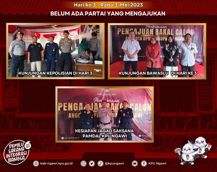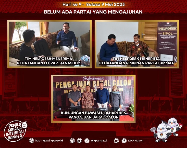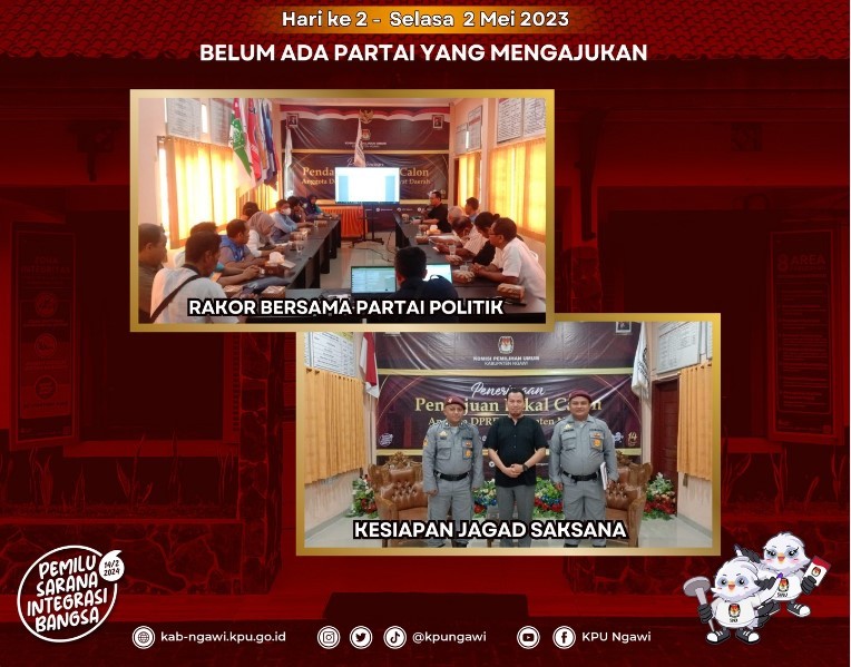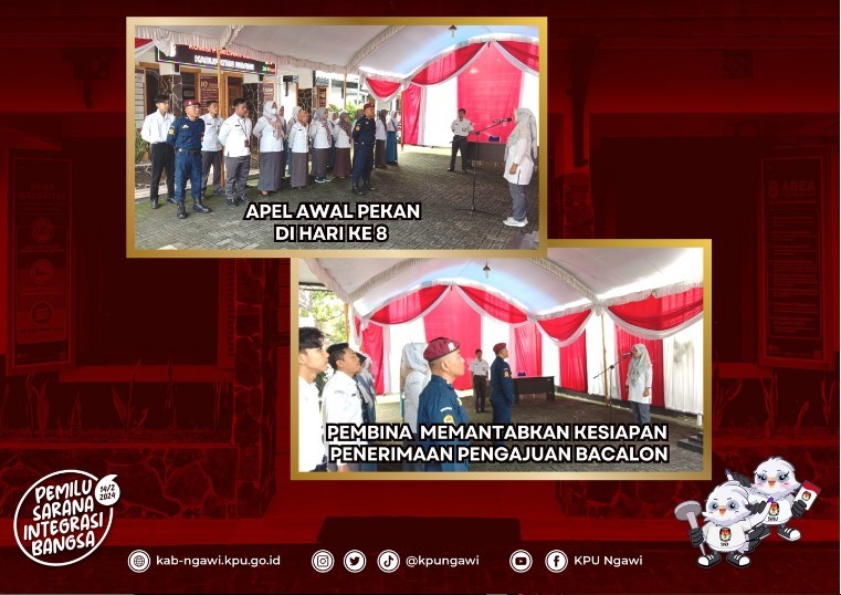 "Tahapan semakin padat, dengan pencalonan anggota DPRD, akan cukup menyita waktu dan pikiran. Maka kita selain menjalankan tugas rutin, harus tetap siap menyambut Partai yang akan hadir di Kantor Kita.” pesan Bu Jakiyem, anggota KPU Ngawi pada Jajaran. Apel pagi diikuti oleh Komisioner, Sekretaris, Pelaksana dan Tenaga Pendukung di lingkup KPU Kabupaten Ngawi.