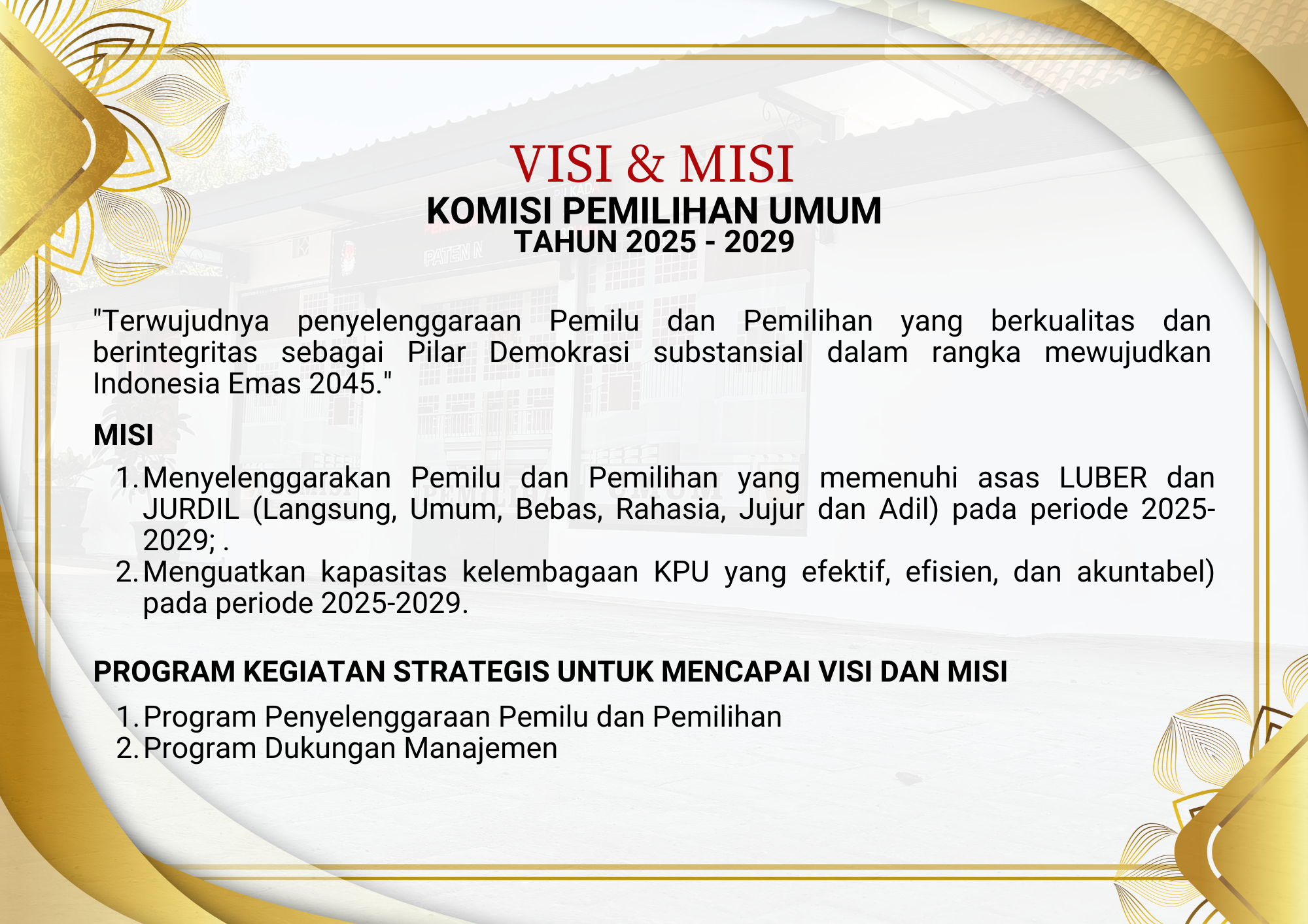 - Menyelenggarakan Pemilu dan Pemilihan yang memenuhi asas LUBER dan JURDIL (Langsung, Umum, Bebas, Rahasia, Jujur dan Adil) pada periode 2025-2029; .